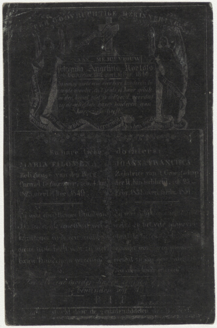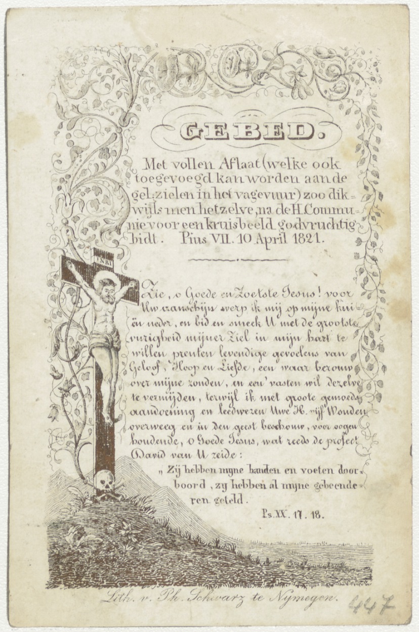 Gebed met vollen aflaat ... Pius VII 10 april 1821 ..., kz. bid voor ziel Petronilla Angelina Roelofs (+1840) en haar dochters Maria Filomena (+1840) en Joanna Francisca (+1851)