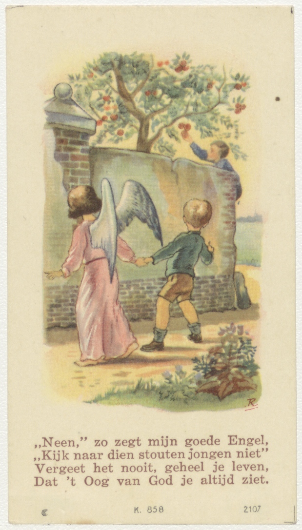 Beschermengel met kind aan de hand kijken naar kind die appel steelt, met "Neen, zo zegt mijn goede engel, kijk naar dien stoute jongen niet ..."