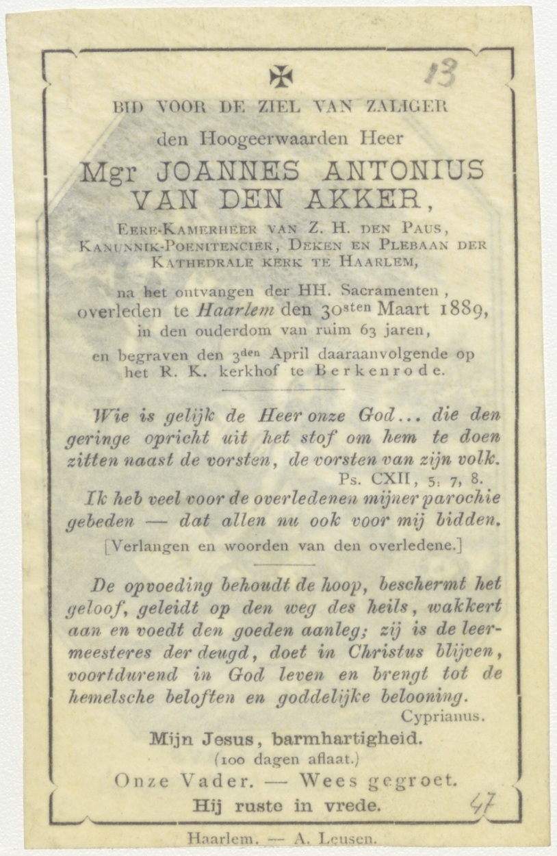 H. Hiëronymus, kz. Religieus;Bid voor ziel Joannes van den Akker (+1889), deken van Haarlem;Haarlem;Berkenrode