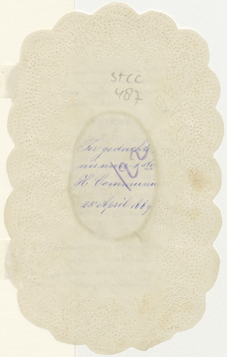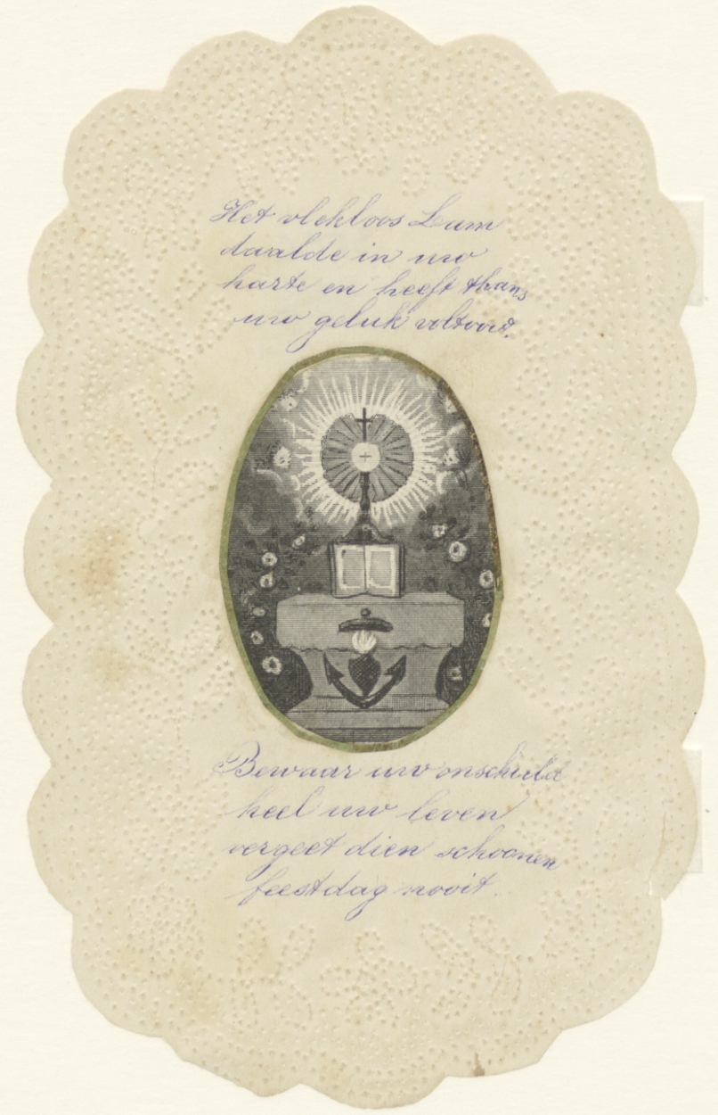 Communieprent met hostie in stralenkrans en met "Het vlekloos Lam daalde in uw harte ...", kz. met "Ter gedachtenis uwer 1ste H. Communie 25 april 1869"