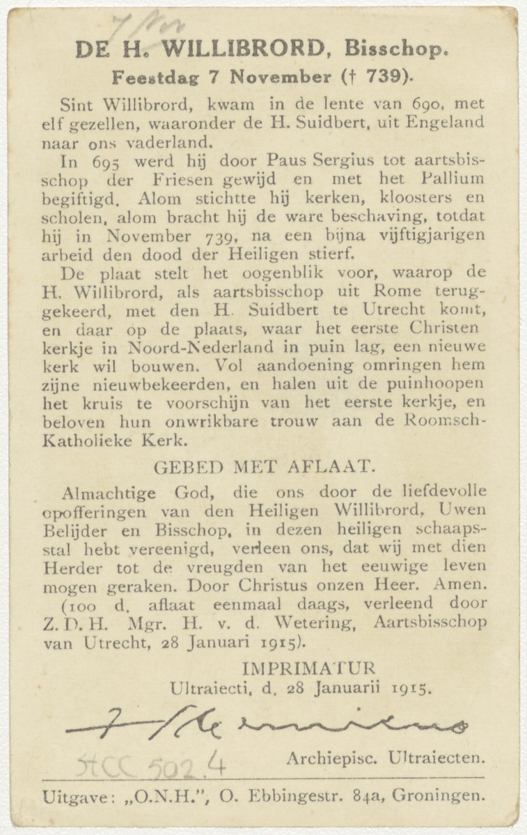 1e Serie Onze Vaderlandsche Heiligen No. 4: H. Willibrord, kz. levensbeschrijving, gebed