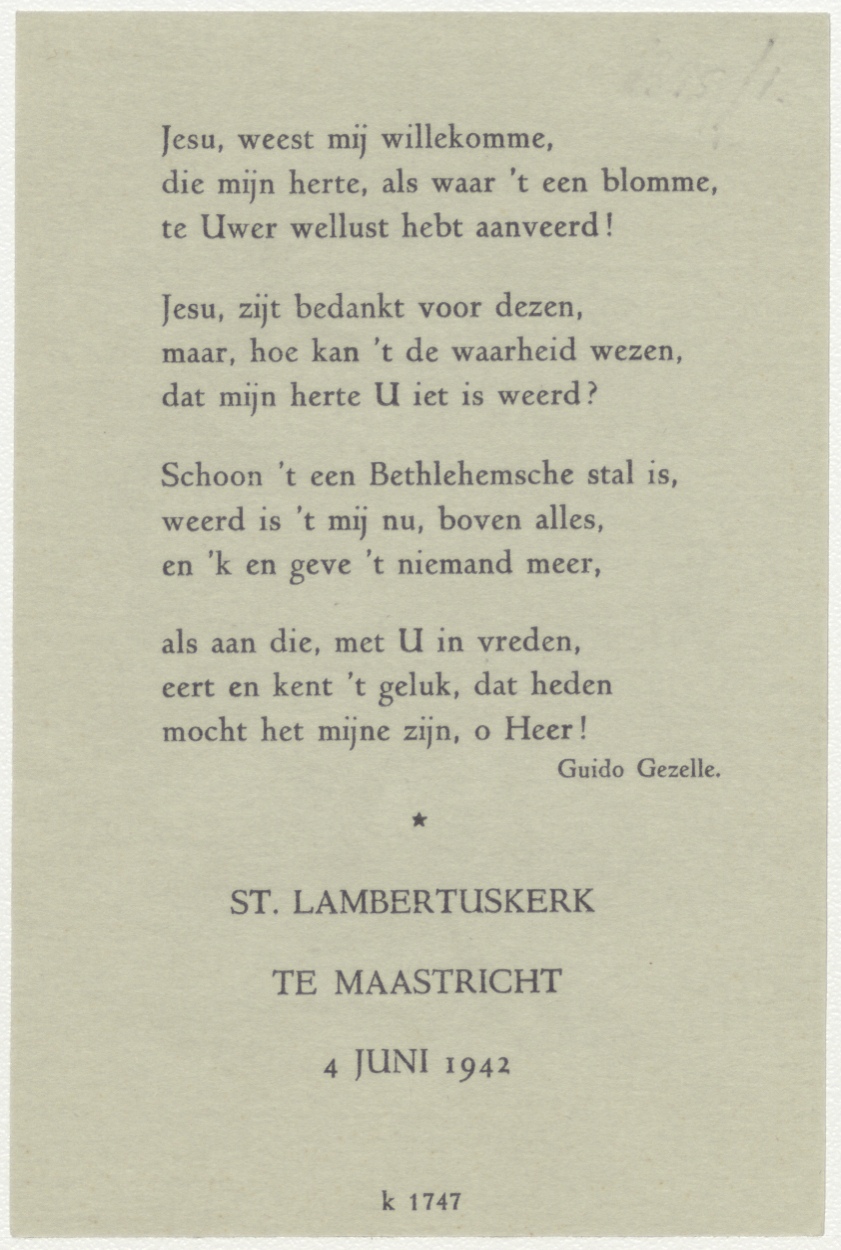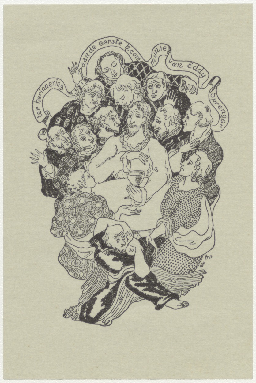 Laatste avondmaal met banderol met "Ter herinnering aan de eerste h. communie van Eddy Sprenger", kz. gebed van Guido Gezelle, St. Lambertuskerk te Maastricht 4 juni 1942