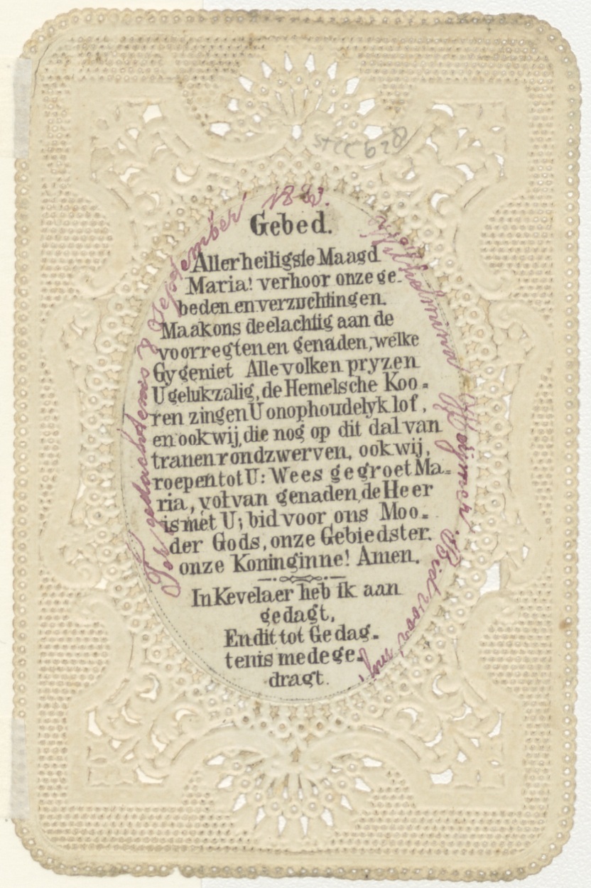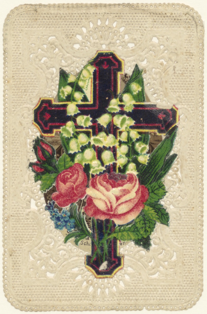 Kruis met bloemen, waarachter Maria van Kevelaer(?), kz. gebed, en Ter gedachtenis 8 september 1883 Wilhelmina Heijmer Bid voor mij