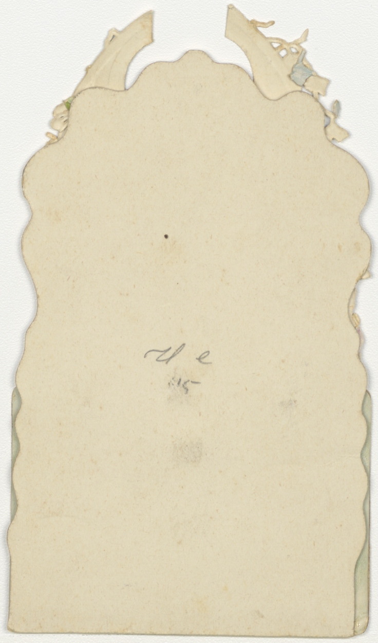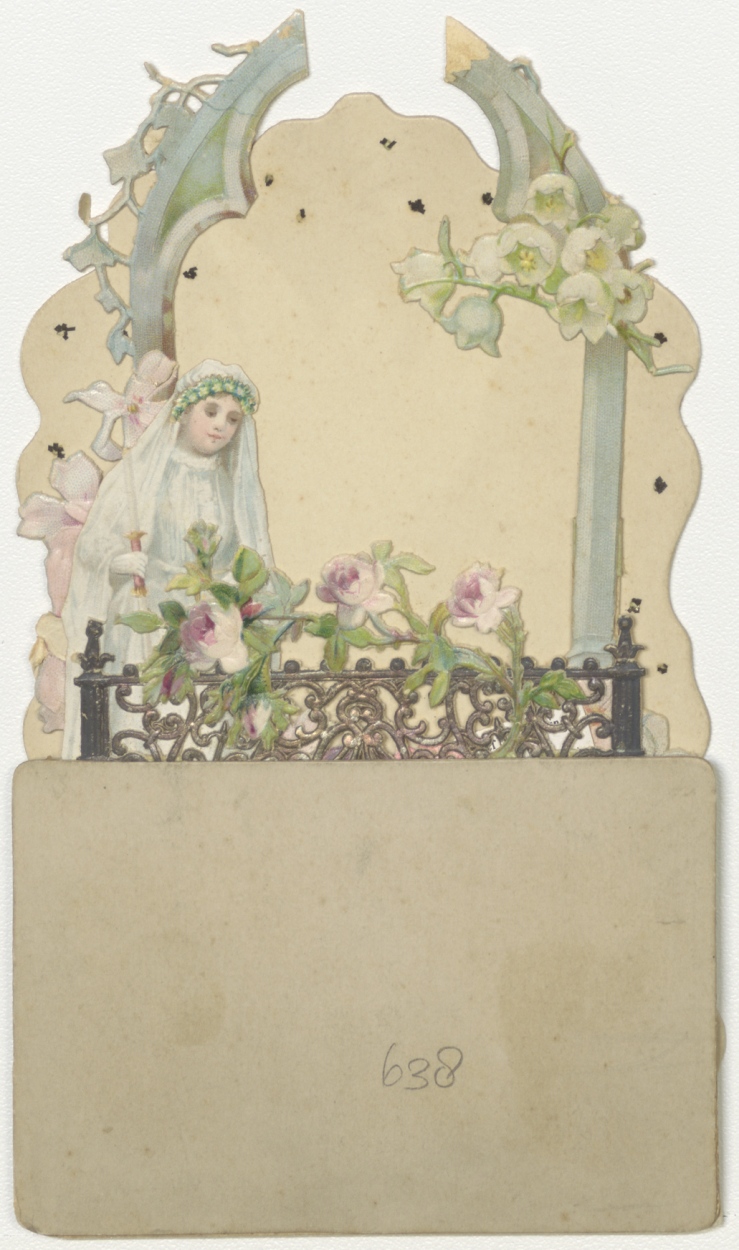 Communieprent met bruidje achter hekje met rozen, met "Ter herinnering aan Uwe eerste H. Communie"
