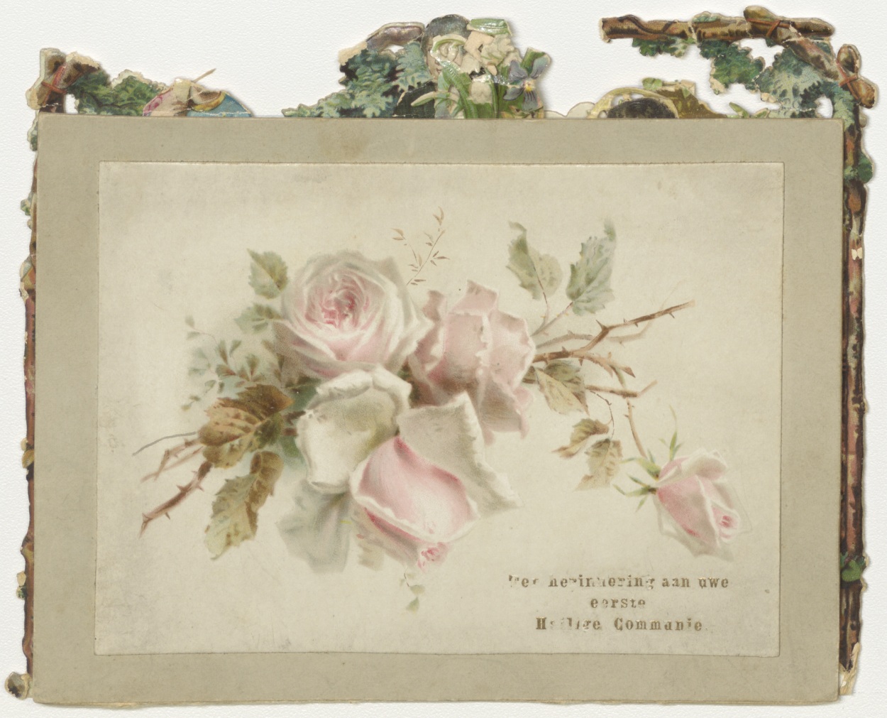 Communieprent met communicant in zwart pak temidden van vier engelen