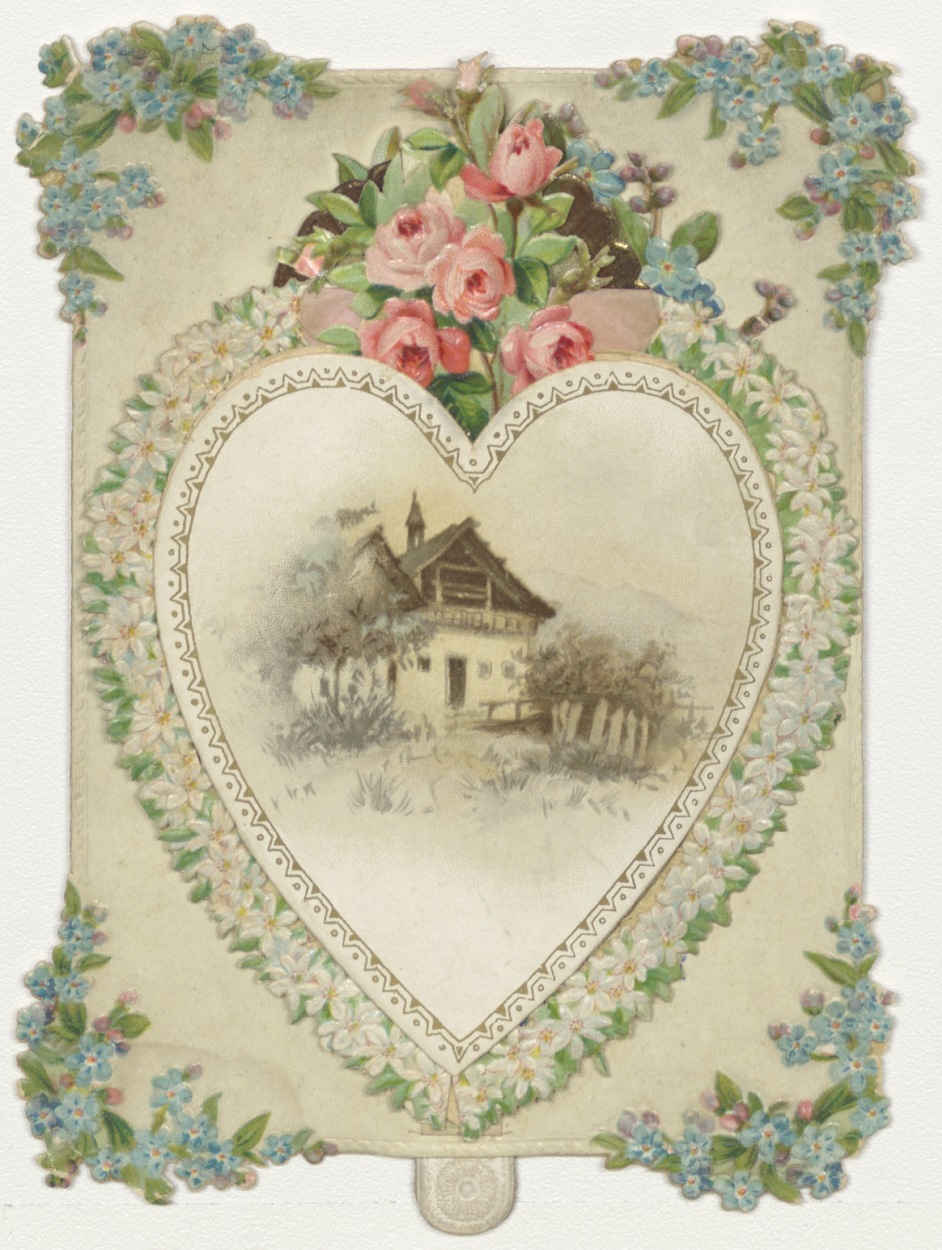 Communieprent met hart waarbinnen bruidje en Jezus, buitenzijde met huisje in de bergen