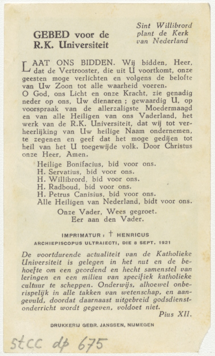 Sint Willibrord, kz. gebed voor de R.K. Universiteit te Nijmegen