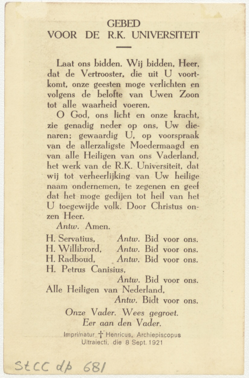 St. Willibrord, Katholieken voltooit zijn werk in uw eigen universiteit, kz. gebed voor de R.K. Universiteit