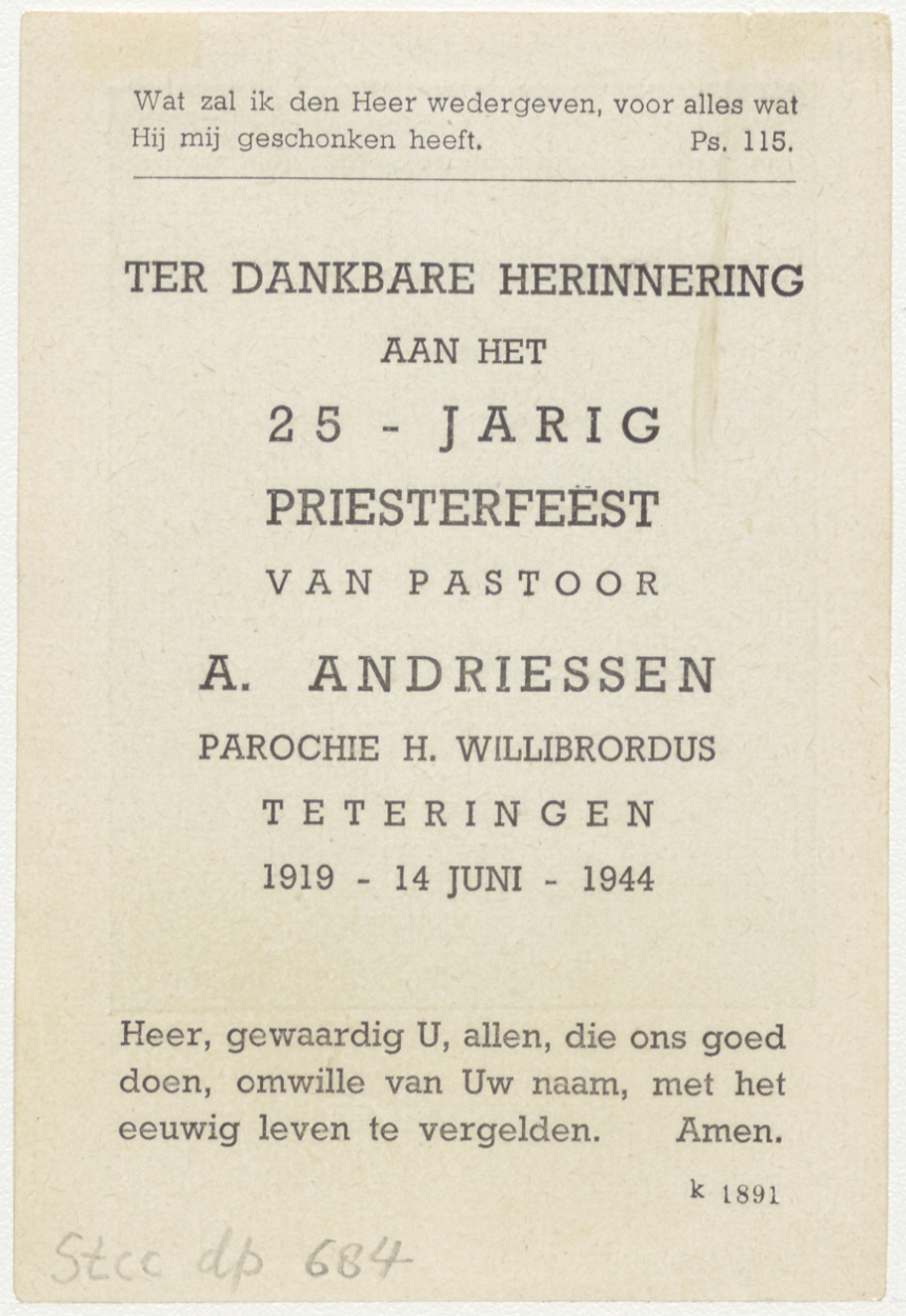 S. Willibrordus, kz. religieus;25-jarig priesterfeest A. Andriessen, 1944, Teteringen