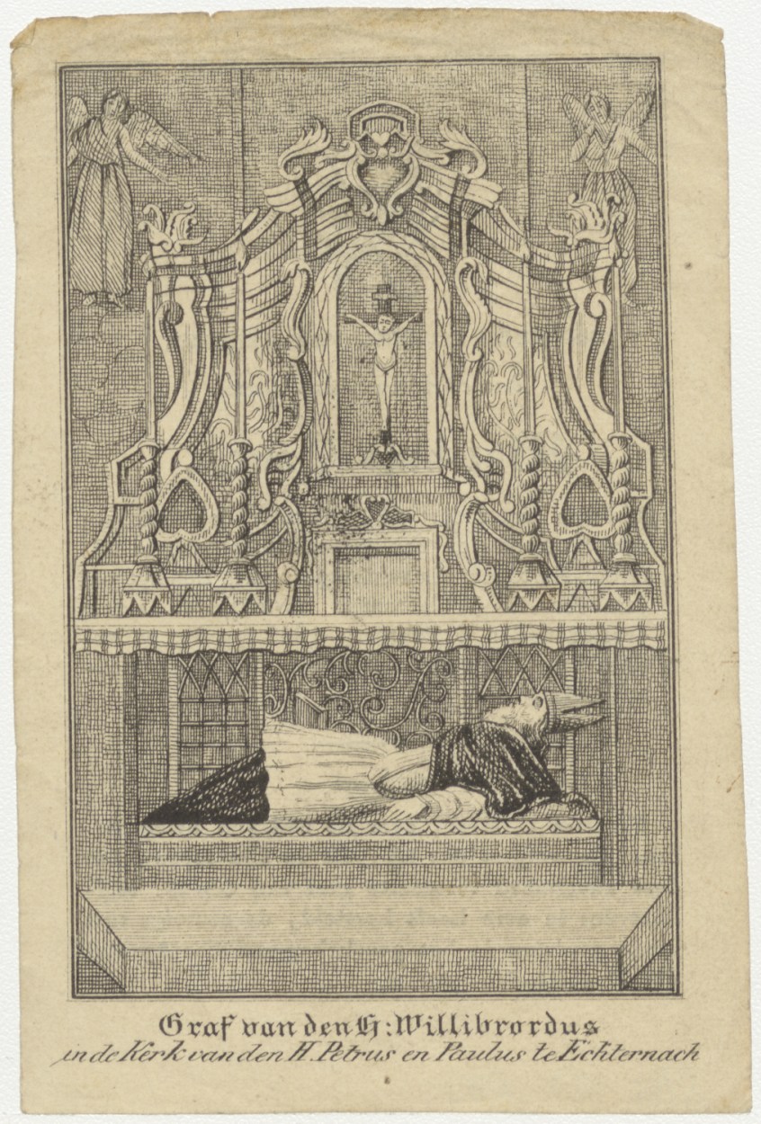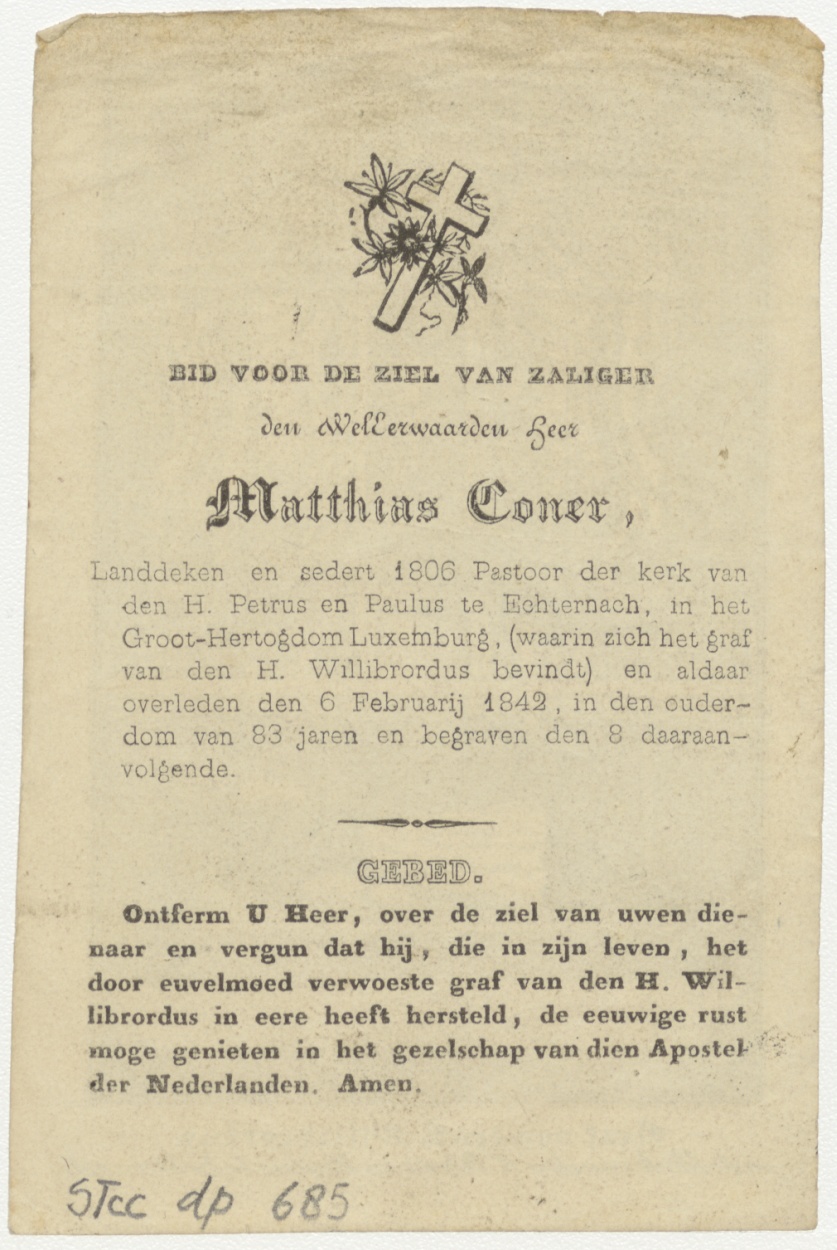 Graf van den H. Willibrordus in de kerk van den H. Petrus en Paulus te Echternach, kz. religieus;Bid voor ziel Matthias Coner (+1842);Echternach