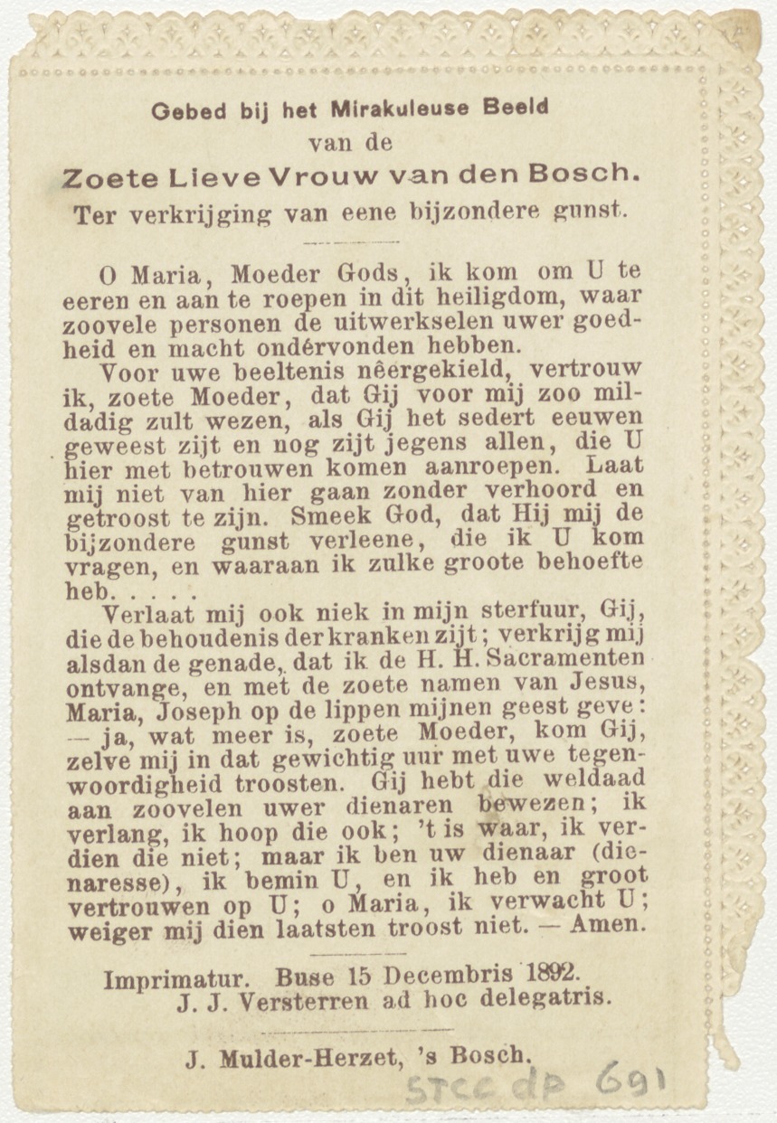 Onze Lieve Vrouw van Den Bosch, met mantel, gekroond, en St. Janskerk, kz. Gebed