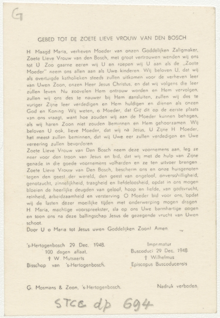 Onze Lieve Vrouw van Den Bosch, met mantel, foto, kz. Gebed;imprimatur 1948