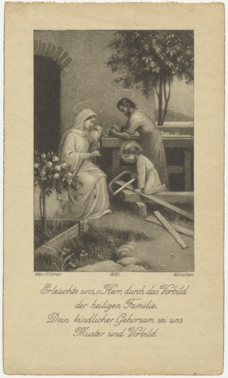 H. Familie, Jozef als timmerman, Jezus zaagt, Maria spint, kz. gedichtjes in handschrift