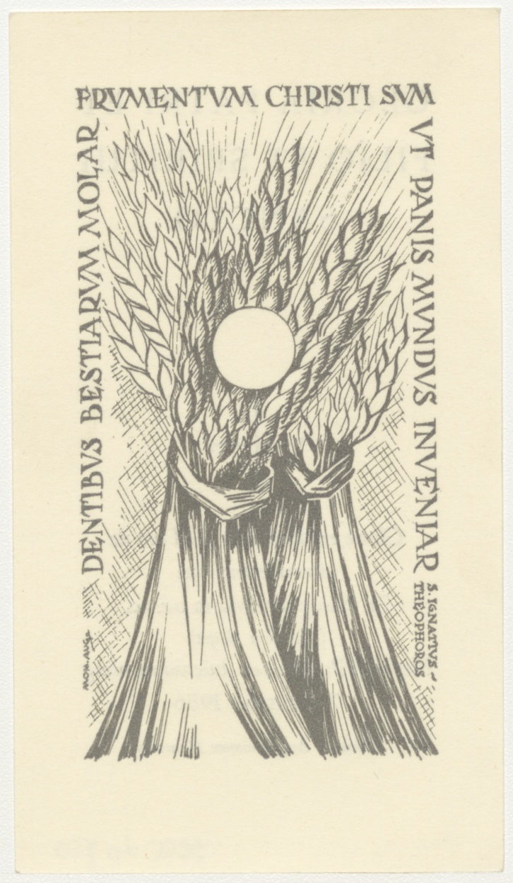 Korenschoof met hostie en "Dentibus bestiarum molar frumentum Christi sum ...", kz. Professie Zr. Theofore Maria O.E.S.A. Ans van Zeijst; Maarssen