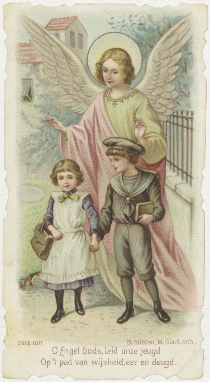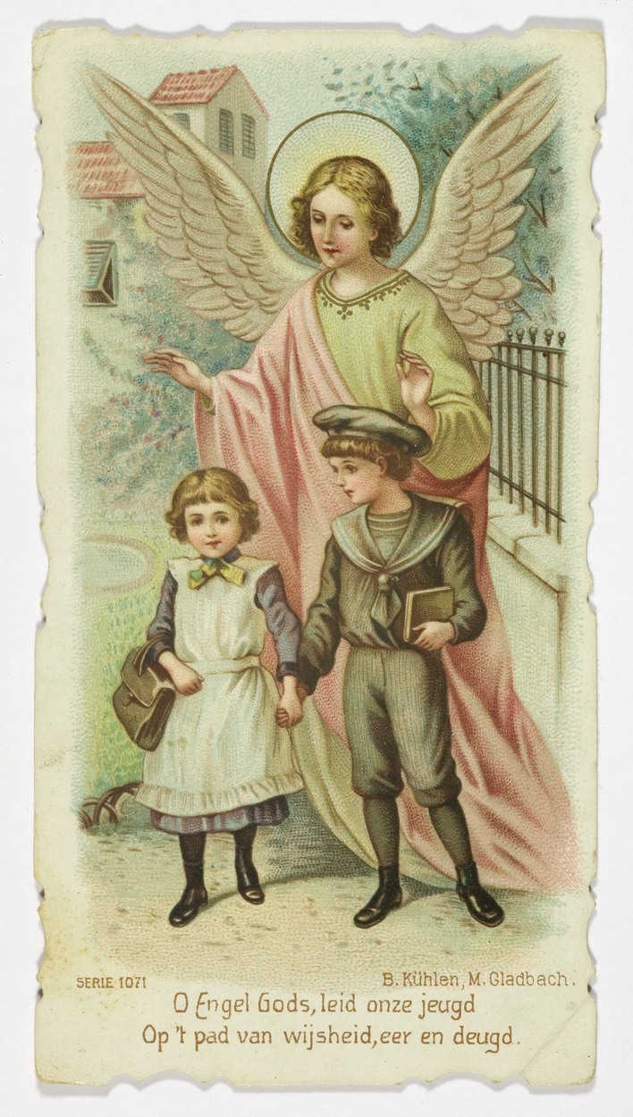 Engelbewaarder begeleidt een jongetje en meisje op weg naar school, met "O engel Gods, leid onze jeugd op 't pad van wijsheid, eer en deugd.", kz. Gedicht: "Wanneer gij uit den slaap ontwaakt, ..."