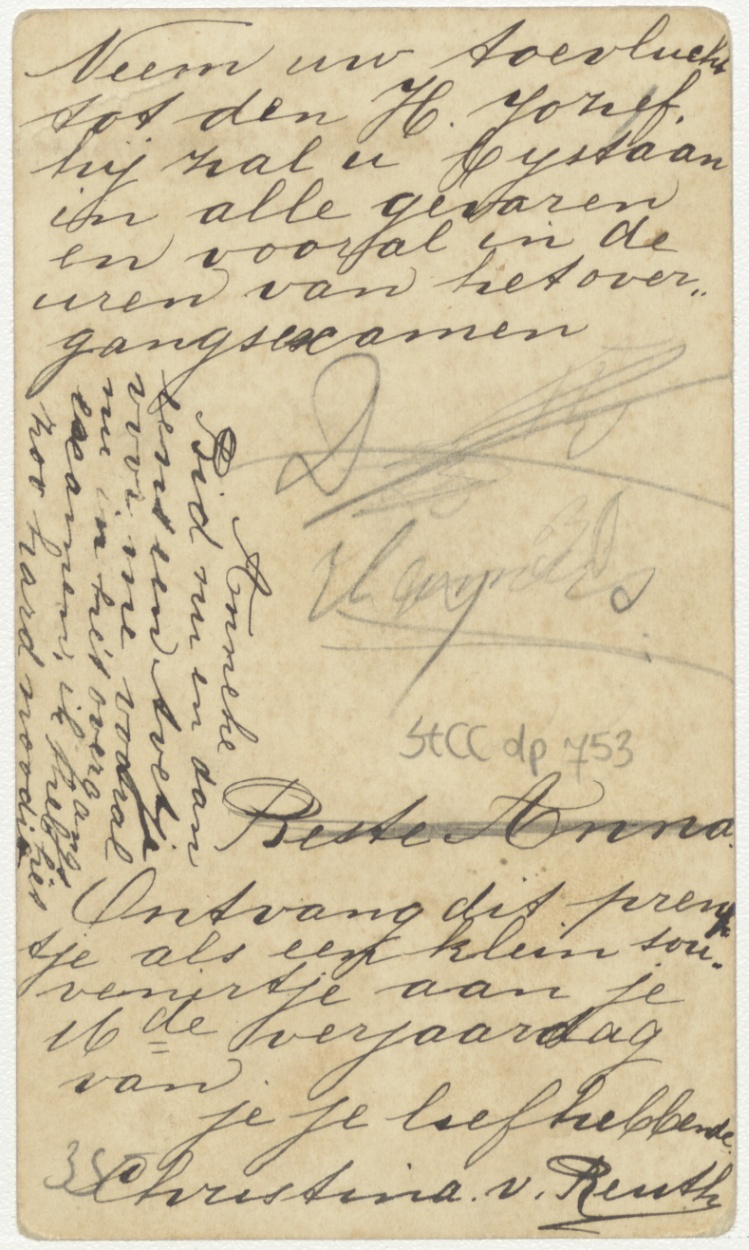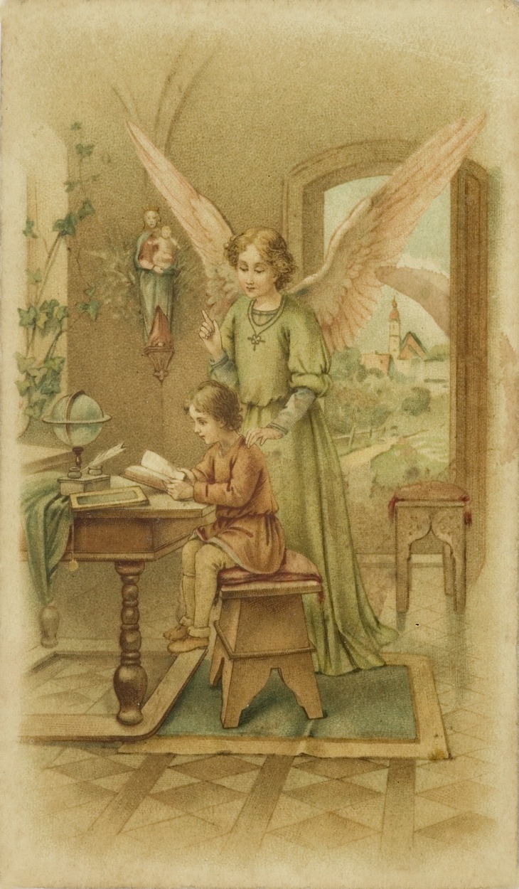 Engelbewaarder staat achter lezend kind, kz. Handgeschreven: "Neem uw toevlucht tot den H. Jozef, hij zal u bijstaan in alle gevaren en vooral in de uren van het overgangsexamen ..."