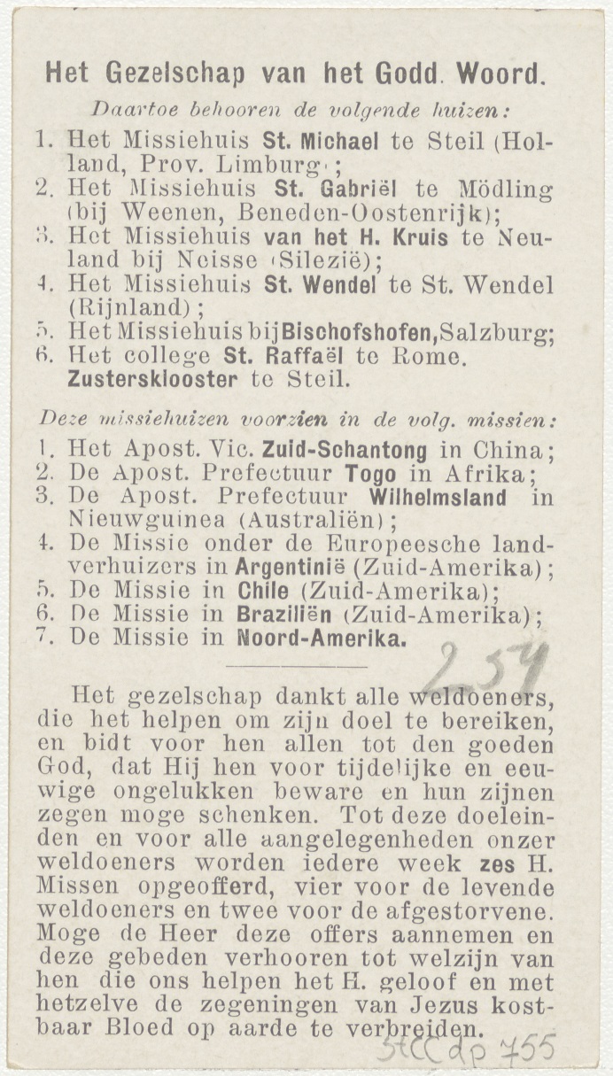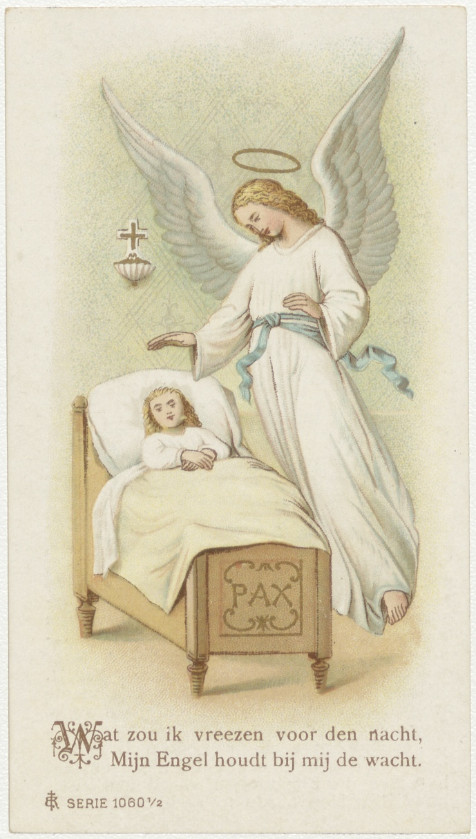 Engel boven slapend kind met "Wat zou ik vreezen voor den nacht, mijn engel houdt bij mij de wacht.", kz. "Het Gezelschap van het Godd. Woord. ..."