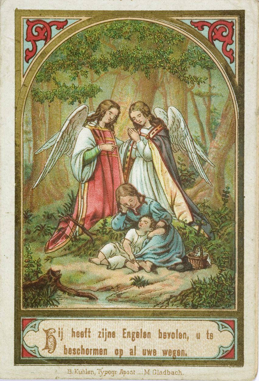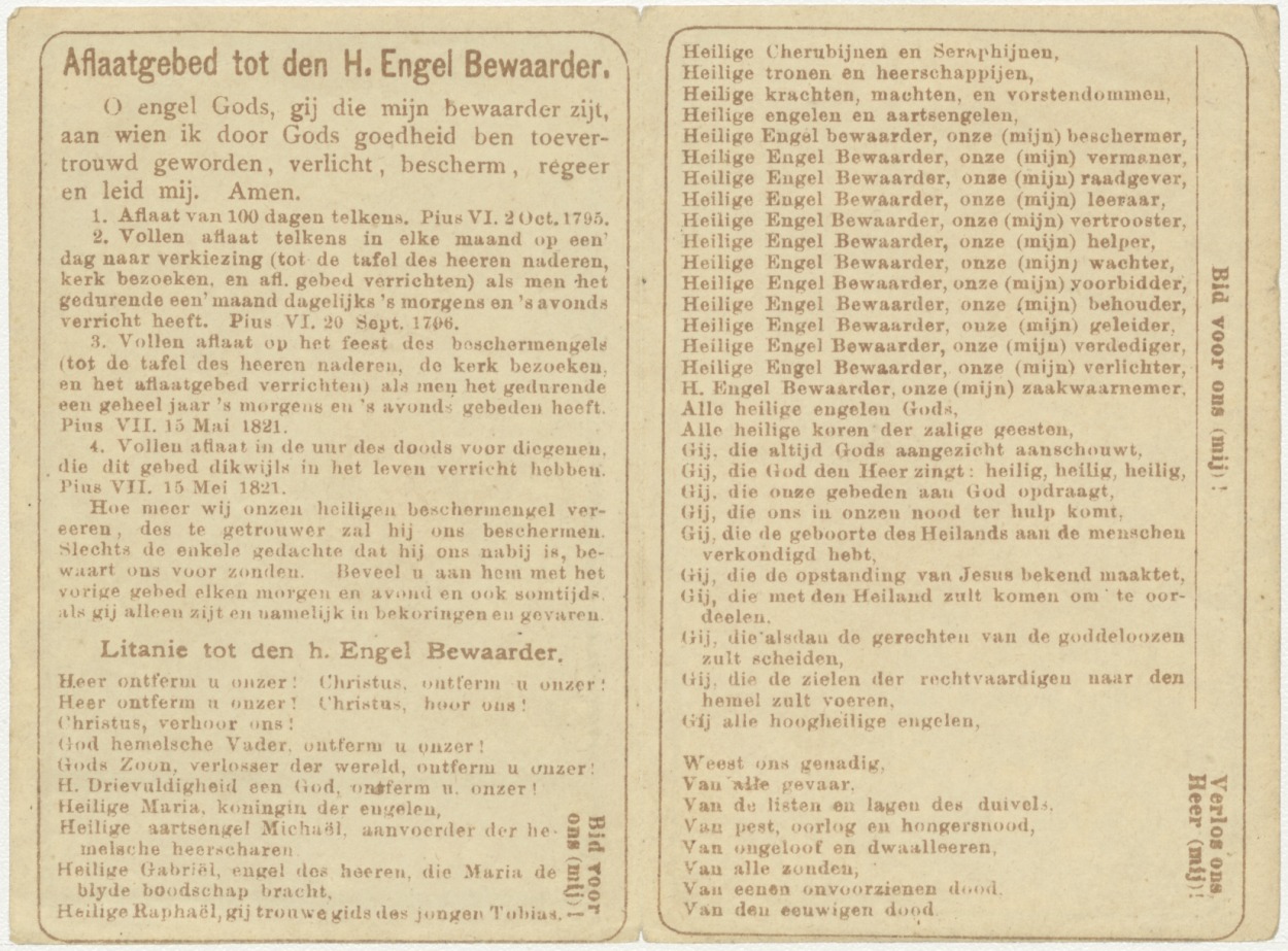 Twee engelbewaarders met "Hij heeft zijne engelen bevolen, u te beschermen op al uwe wegen.", kz. "Wij zondaars, wij bidden u, verhoor ons, Heer, dat gij ons sparet, ..."