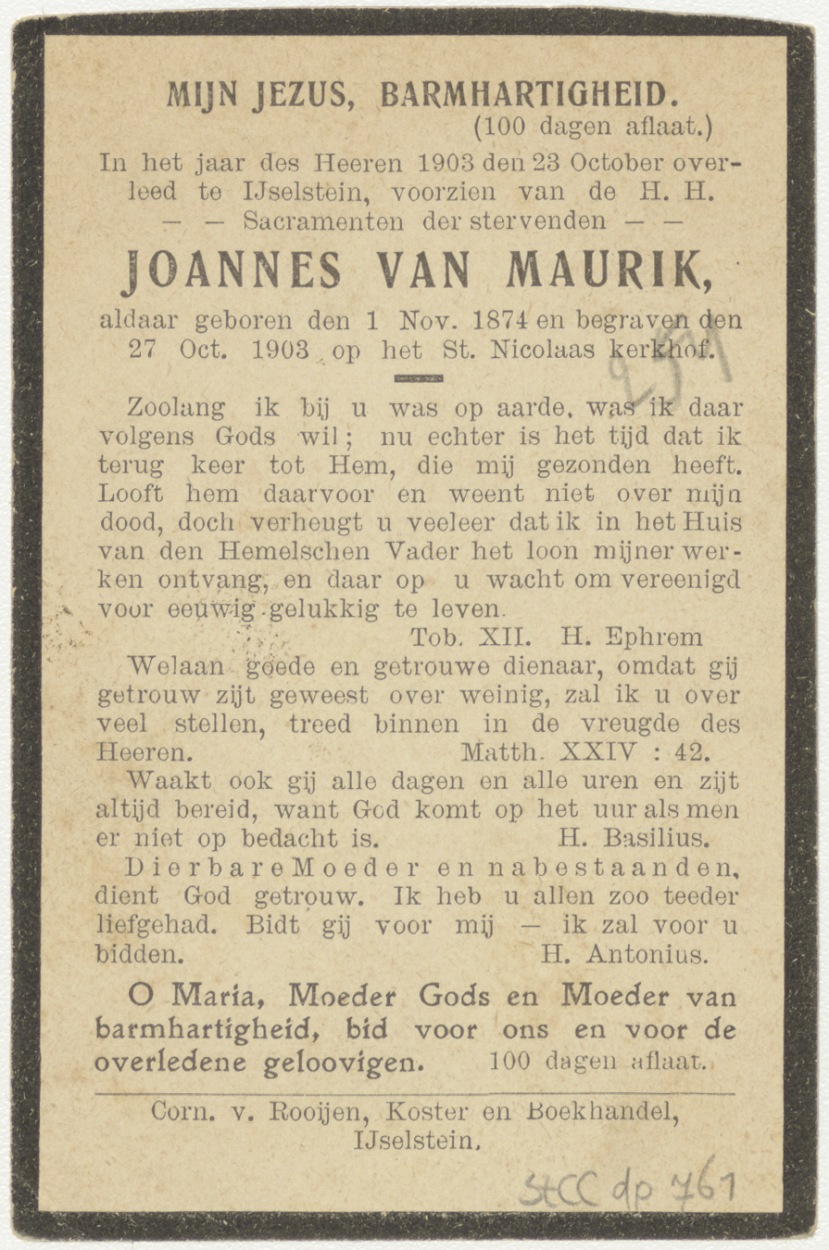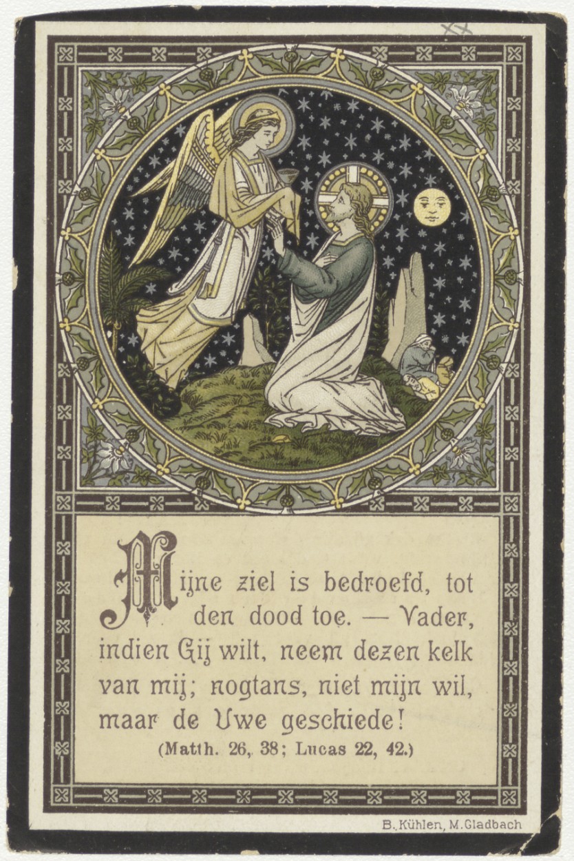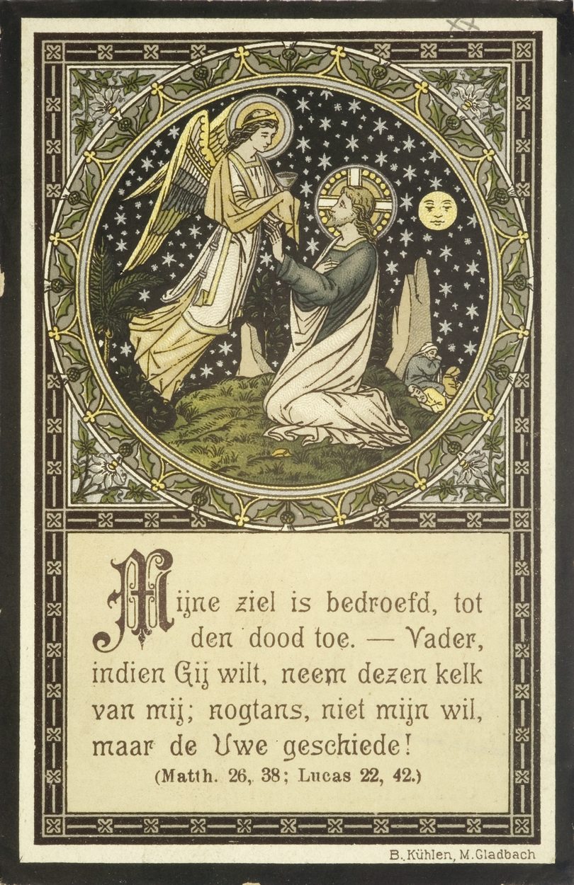 Christus knielend voor engel met kelk, met "Mijne ziel is bedroefd, tot den dood toe. Vader, indien Gij wilt ...", kz. "Mijn Jezus, barmhartigheid (100 dagen aflaat.) ... Joannes van Maurik ... begraven den 27 oct 1903 ..."
