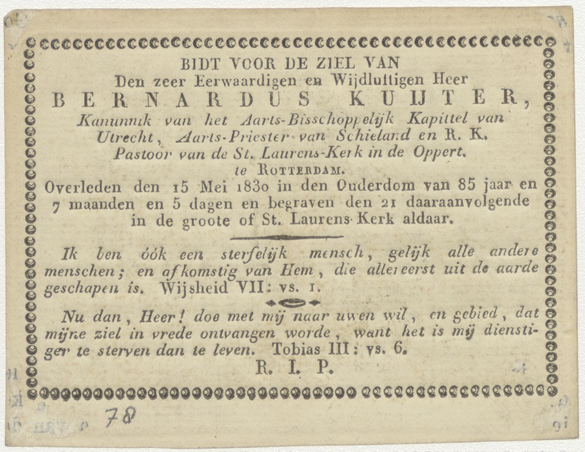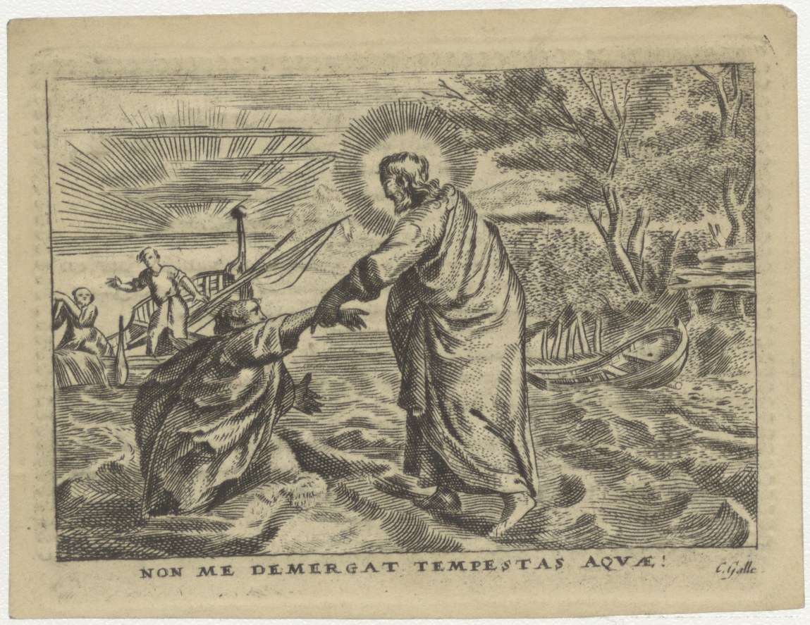Petrus zakt door het water, kz. Religieus; bid voor ziel Bernardus Kuijter (+1830) kanunnik Utrecht, pastoor St. Laurens Rotterdam