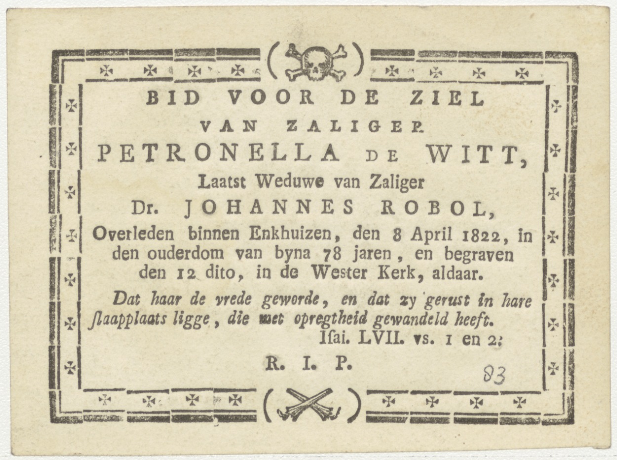 H. Johannes de Doper, kz. Bid voor ziel Petronella de Witt (+1822) Enkhuizen, weduwe van Johannes Robol