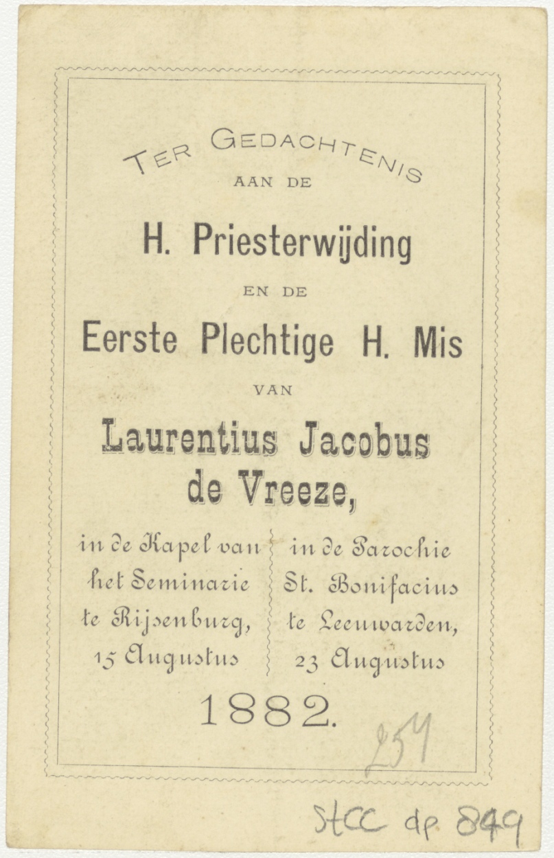 St. Luitgaarde (Lutgardis), kz. Ter gedachtenis aan de H. Priesterwijding ... Laurentius Jacobus de Vreeze ... 1882