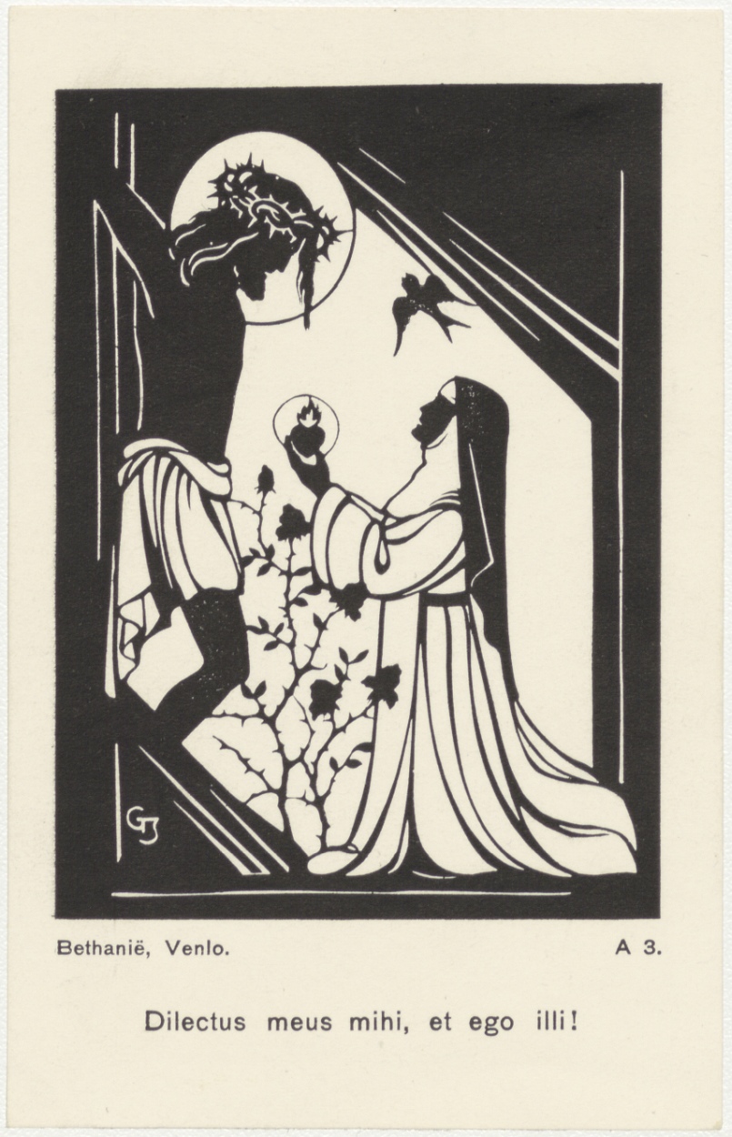 Devotieprent, dominicanes biedt voor de gekruisigde Jezus haar hart aan, met "Dilectus meus mihi, et ego illi", A 3