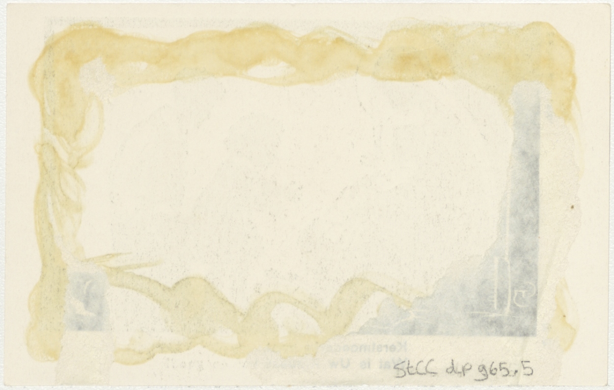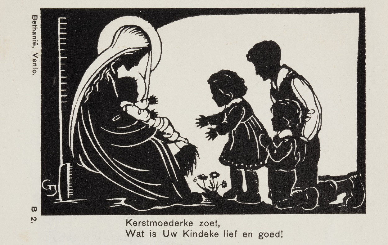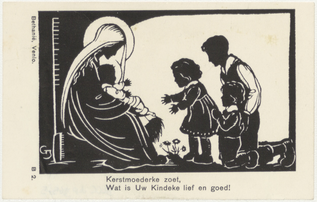 Devotieprent, twee kinderen en een vader knielen voor Maria met Kind, met "Kerstmoederke zoet, wat is uw Kindeke lief en goed!", B 2