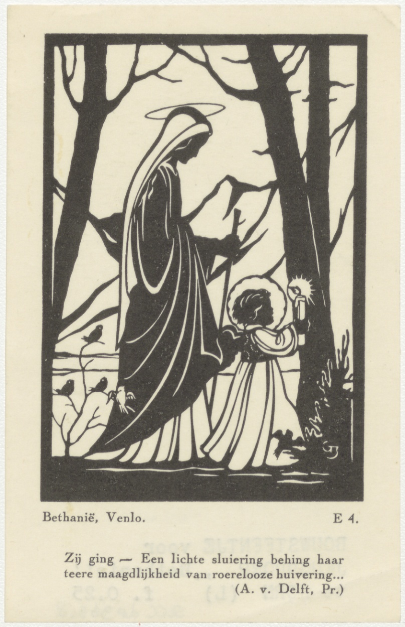 Devotieprent, Maria, op weg naar haar nicht Elisabeth, vooraf gegaan door een engeltje met een kaars, met "Zij ging - Een lichte sluiering behing haar teere maagdlijkheid van roereloose huivering... (A. v. Delft, Pr.)", E 4, kz. Getypte tekst: "Bouwsteentje voor jeugddorp 'Bethanië' te Horn (L) f. 0.25"
