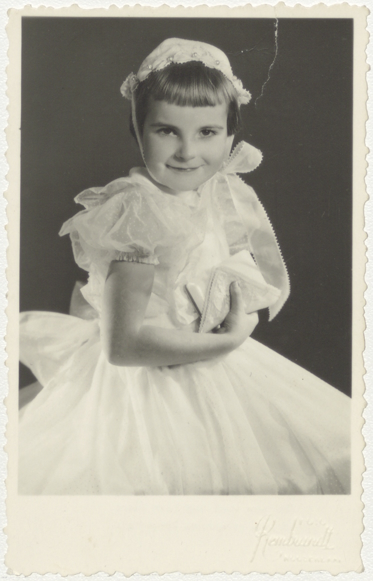 Communieprentje met foto Leonie Elst als communicant, kz. Blijde herinnering aan de Eerste H. Communie van Leonie Elst ... H. Joseph te Roosendaal ... 30 October 1955 ...