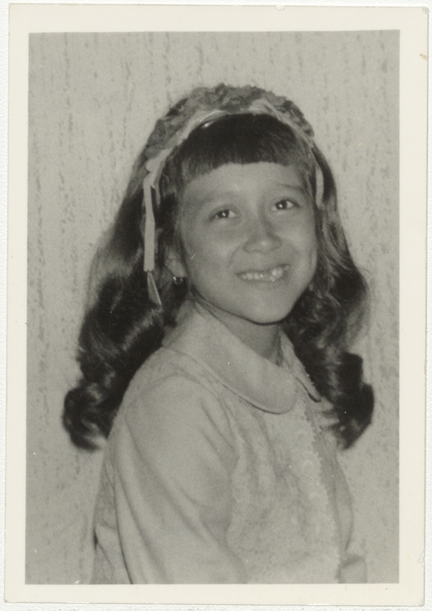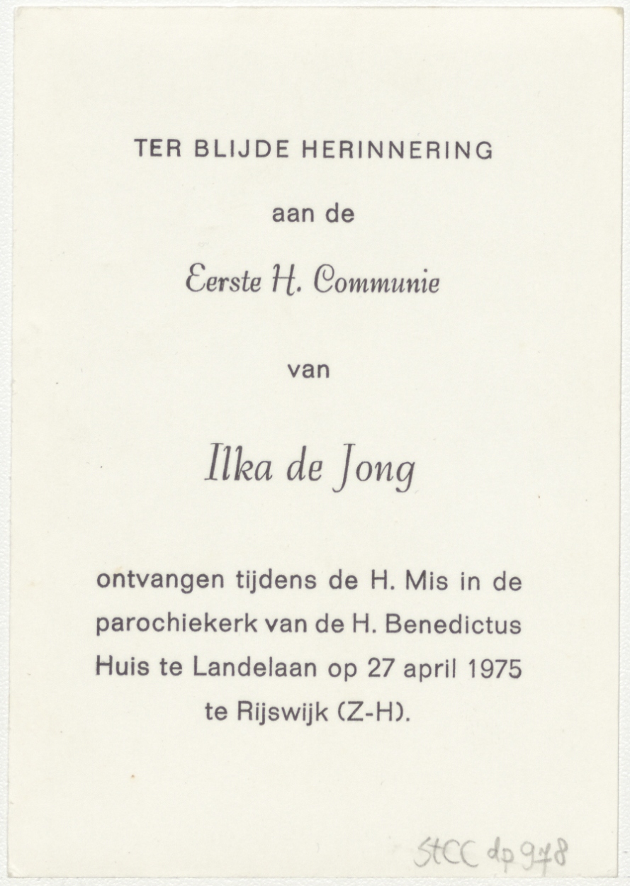 Communieprentje met foto Ilka de Jong als communicant, kz. Ter blijde herinnering aan de Eerste H. Communie van Ilka de Jong ... H. Benedictus Huis ... 27 april 1975 te Rijswijk (Z-H).