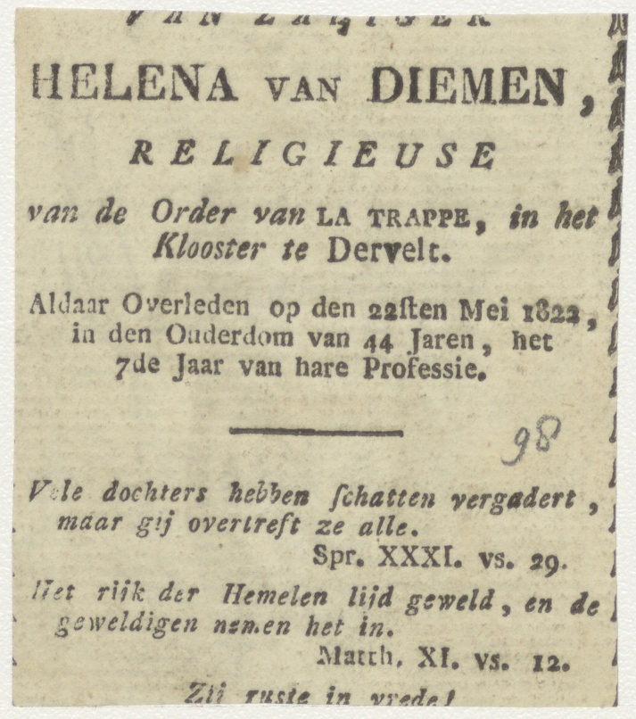 , kz. Religieus;Bid voor ziel Van Diemen (+1822) Dervelt
