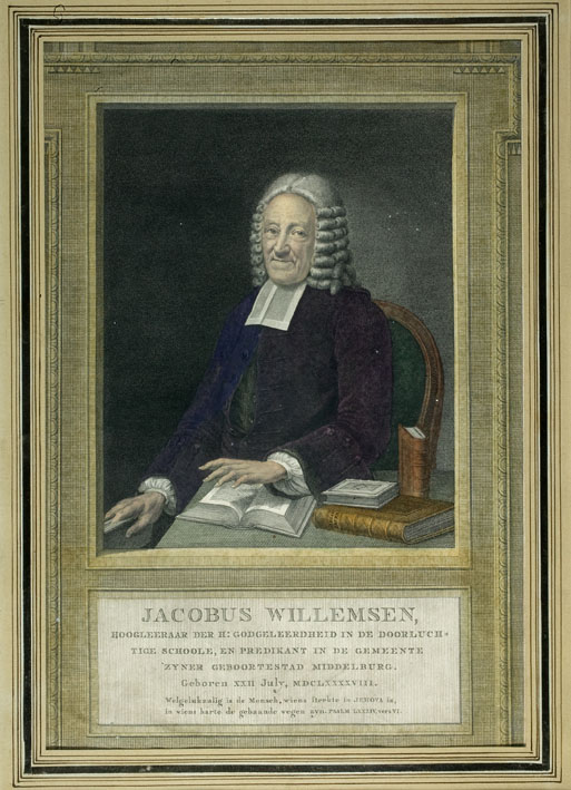 Portret van Jacobus Willemsen (1698-1780), predikant en hoogleraar te Middelburg, ingekleurd