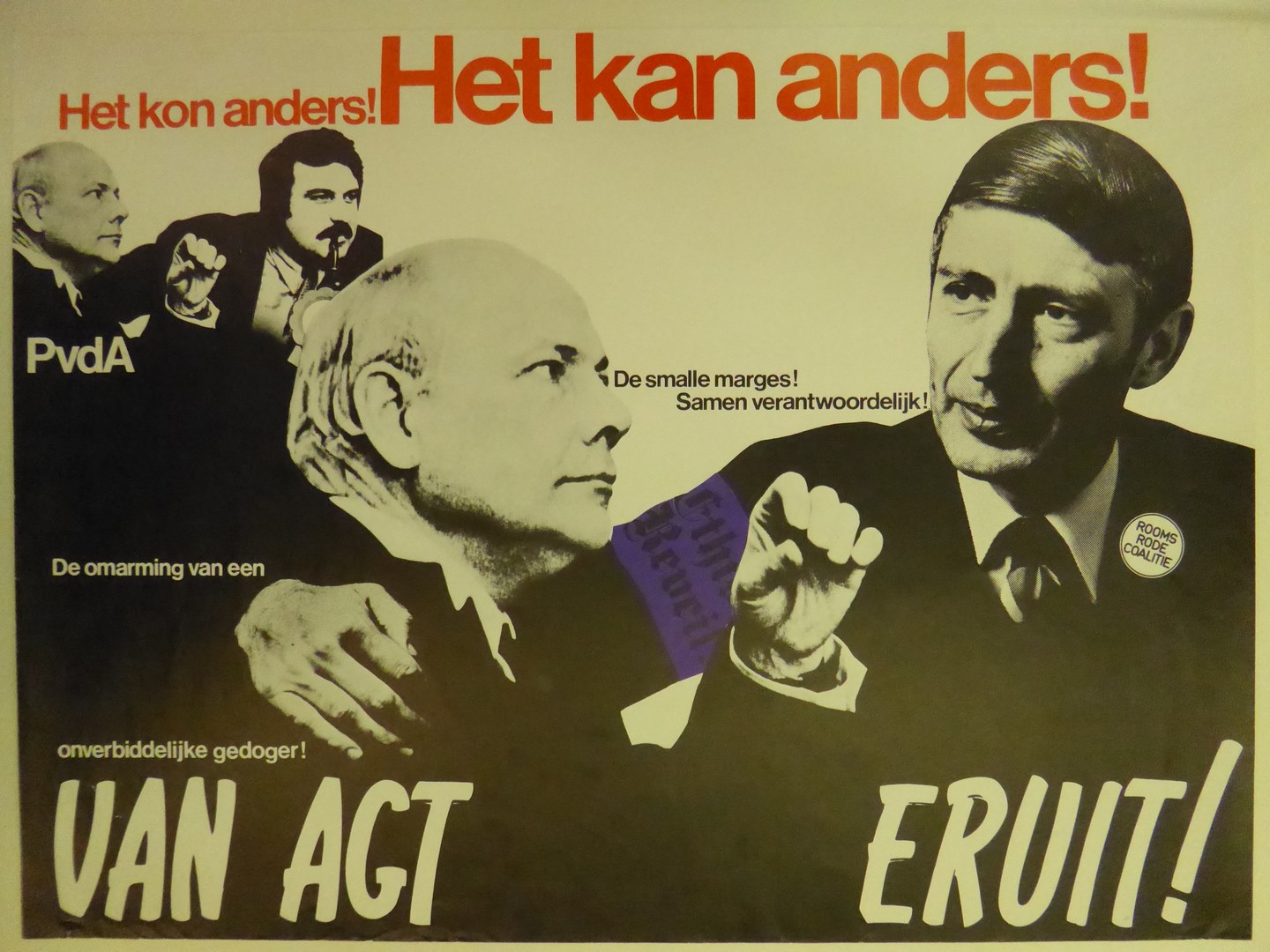 Protestverkiezingsaffiche tegen CDA met "Het kon anders! Het kan anders!", Van Agt omarmt Den Uyl
