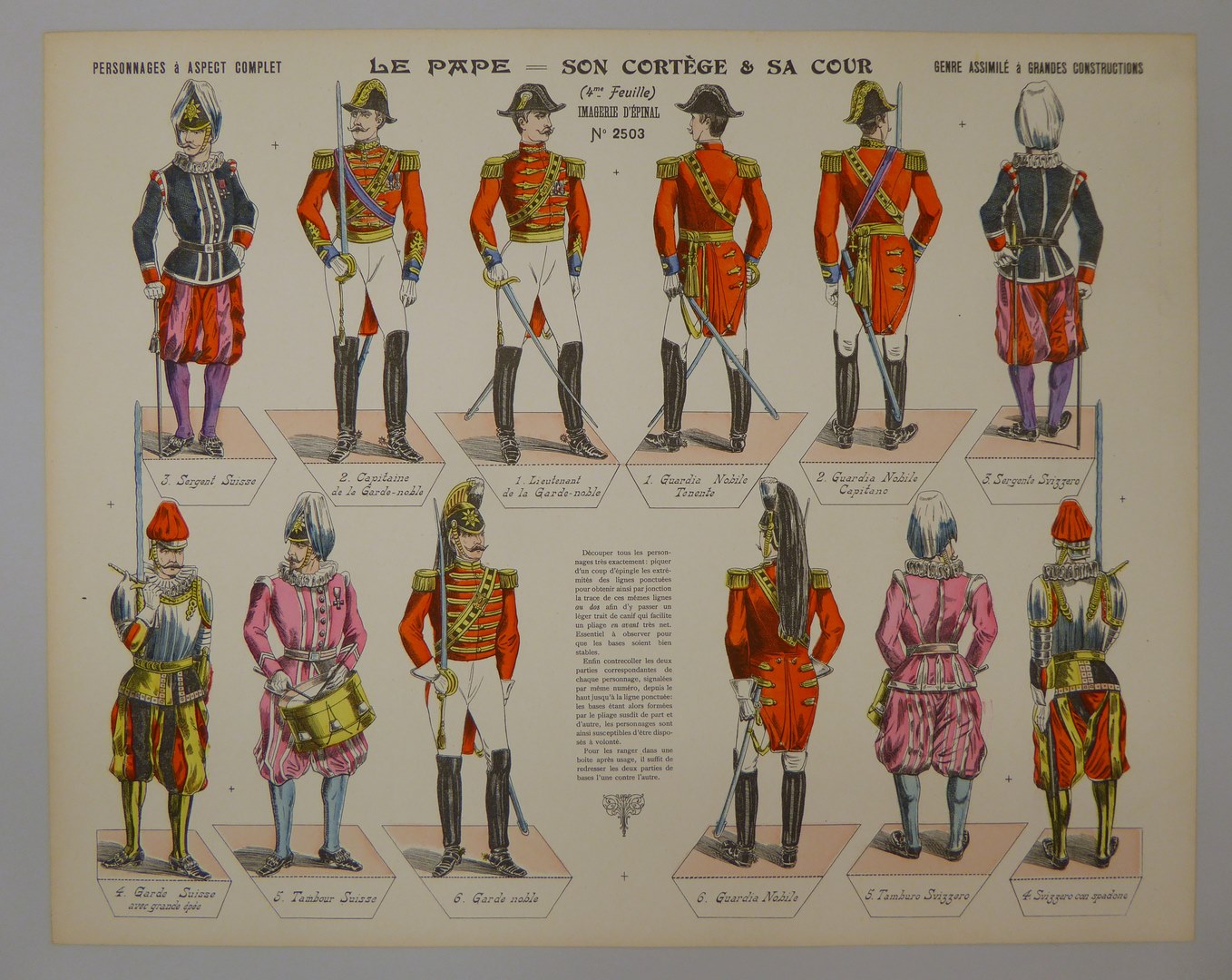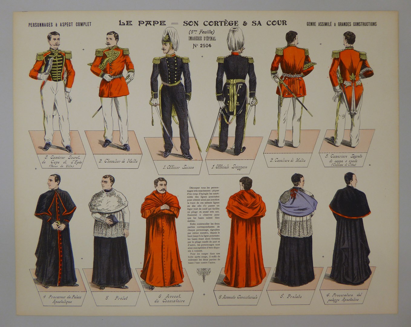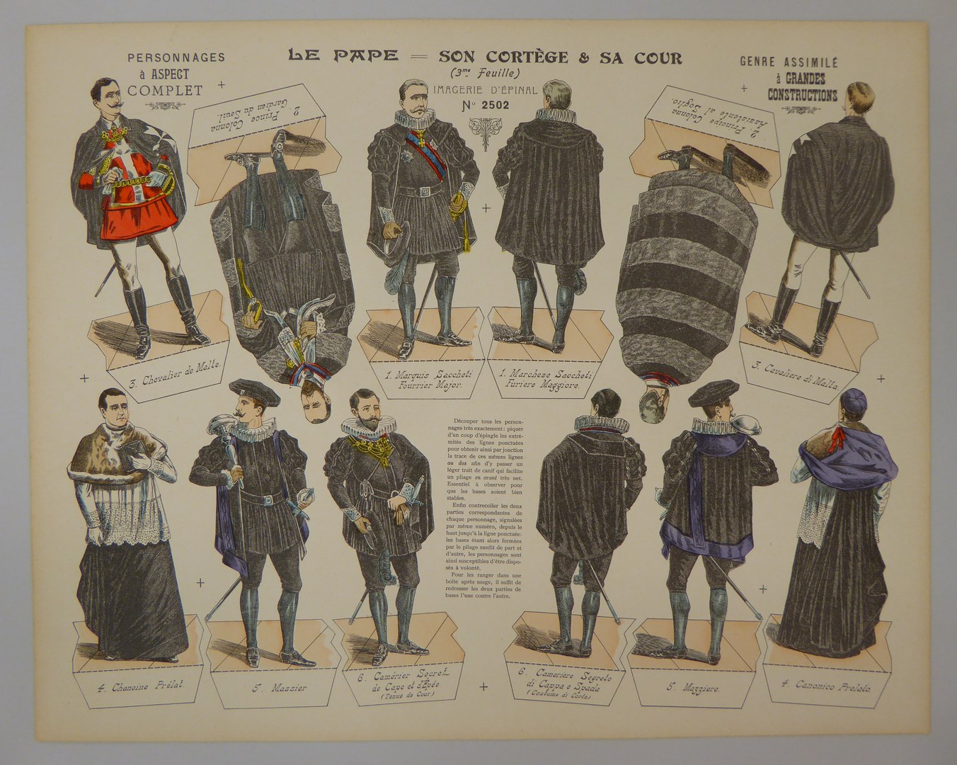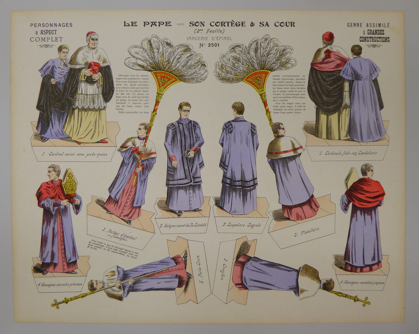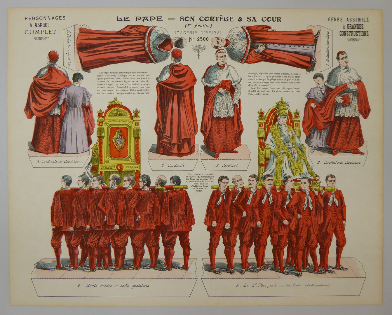 Kavel van zeven knip-prenten van Leo XIII, in een draagstoel met zijn hofhouding