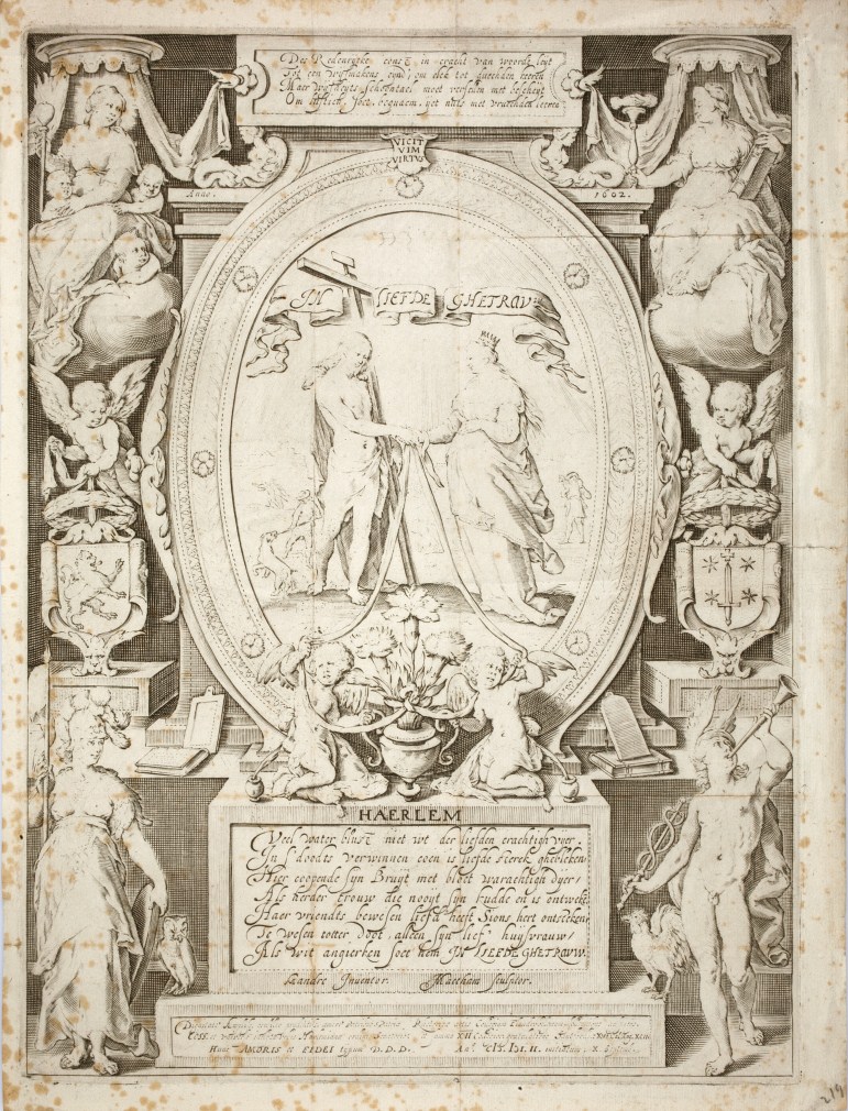 Prent op de Haarlemse rederijkerskamer met de voorstelling van Christus en Fides voor een landschap met de Goede Herder in een medaillon. In een banderol: 'In Liefde Ghetravw'. Het medaillon rust op een sokkel waarop twee putti en een vaas anjers. Op de sokkel een zevenregelig vers. Geheel boven in een cartouche een vierregelig vers. ...