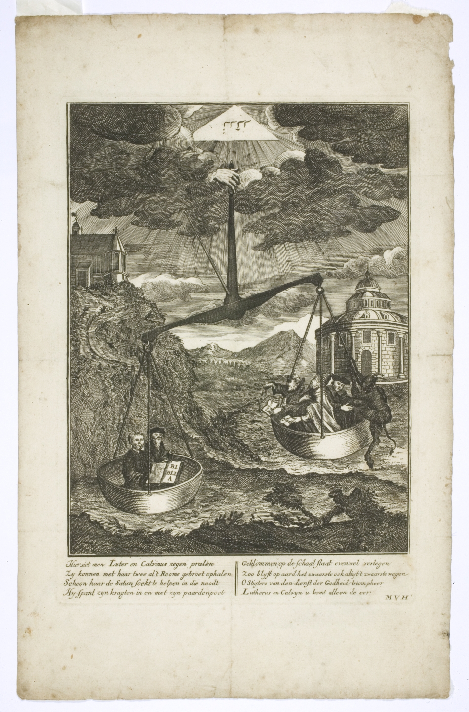 Weegschaal met Luther en Calvijn tegenover "Rooms gebroet" met duivel. Onder de prent een 8-regelig vers in twee rijen, ondertekend met 'MVH': Hier siet men Luter en Calvinus zegen pralen Zy konnen met haar twee al 't Rooms gebroet ophalen Schoon haar de Satan soekt te helpen in die noodt Hij spant zijn krachten in ...