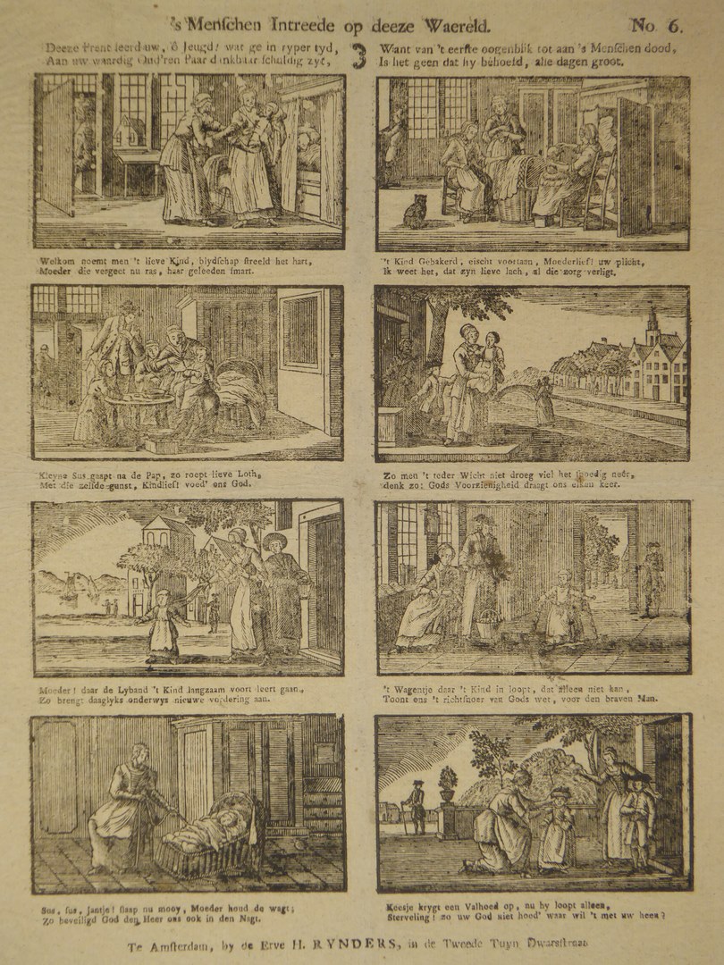 Acht plaatjes met tekst over het opgroeiende kind met "'s Menschen intreede op deeze waereld No.6"