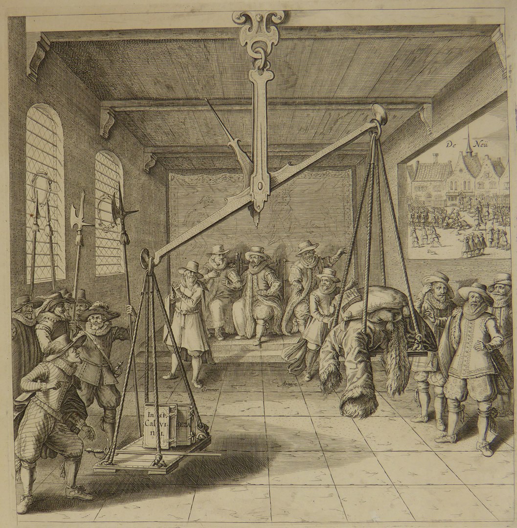 In een vertrek bevindt zich een weegschaal die niet in balans is. Links, op de zware zijde van de schaal, liggen de werken van Calvijn en Beza, waar Maurits zojuist zijn zwaard bij heeft gelegd. Op de lichte zijde van de weegschaal bevinden zich de 'kussens van de raad', de 'rock' van de advocaat (Oldenbarnevelt) ...