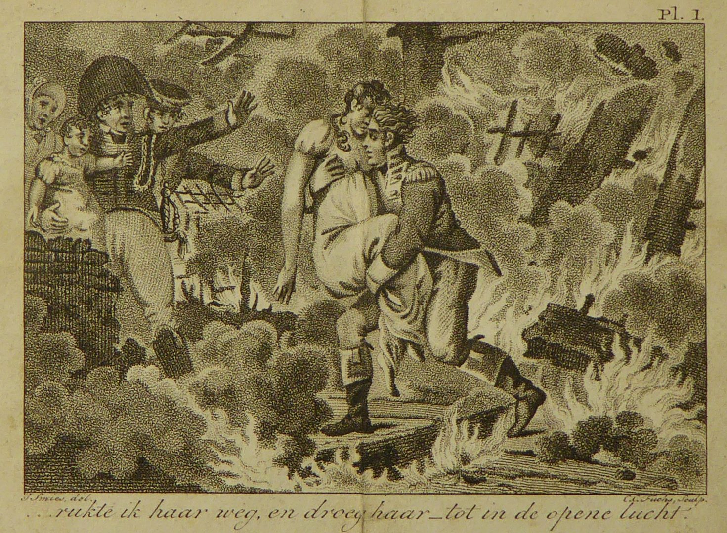 Man met vrouw in armen in vuurzee met "... rukte ik haar weg, en droeg haar tot in de opene lucht"