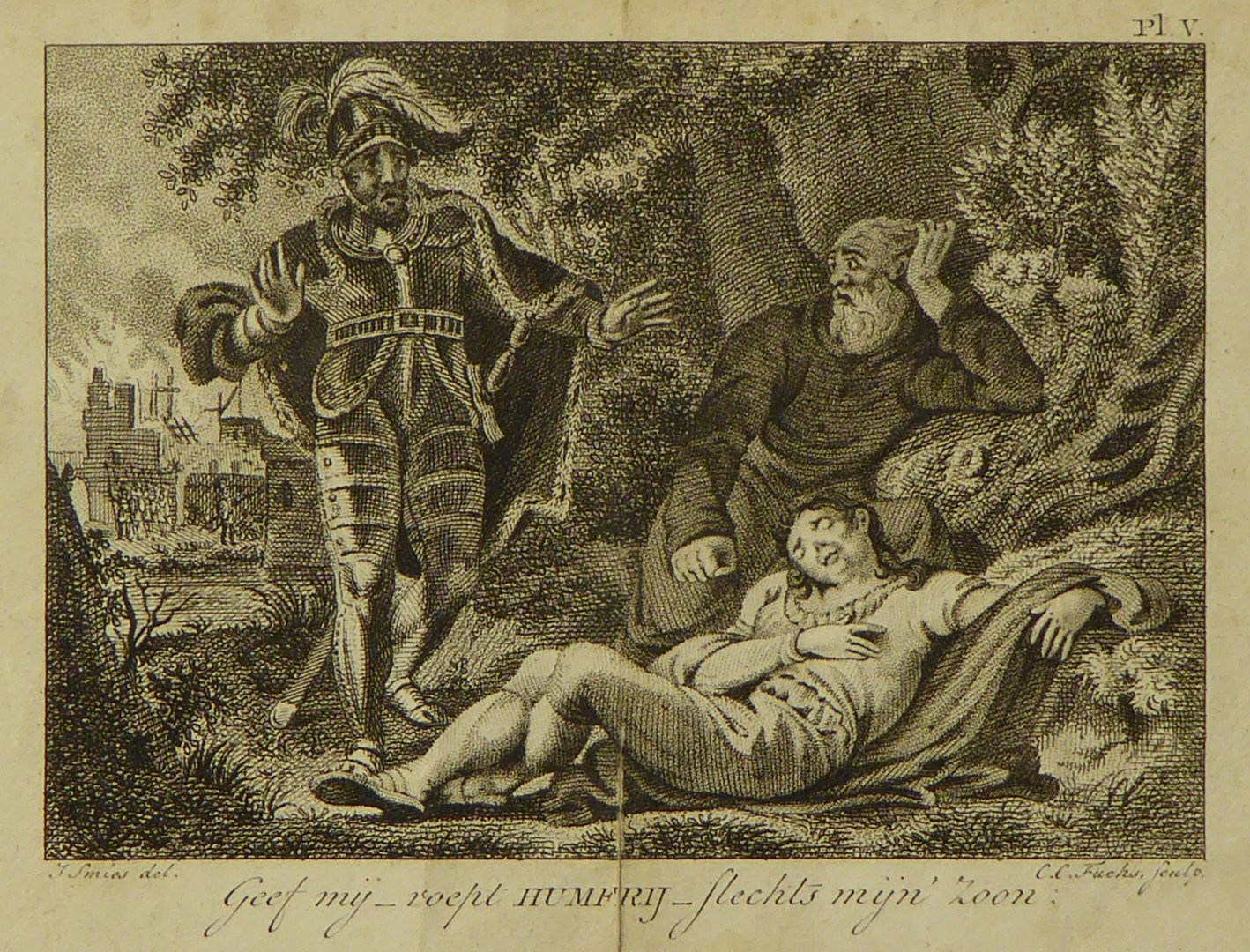 Drie mannen met op achtergrond brandend gebouw met "Geef mij - roept Humfrij - slechts mijn Zoon"