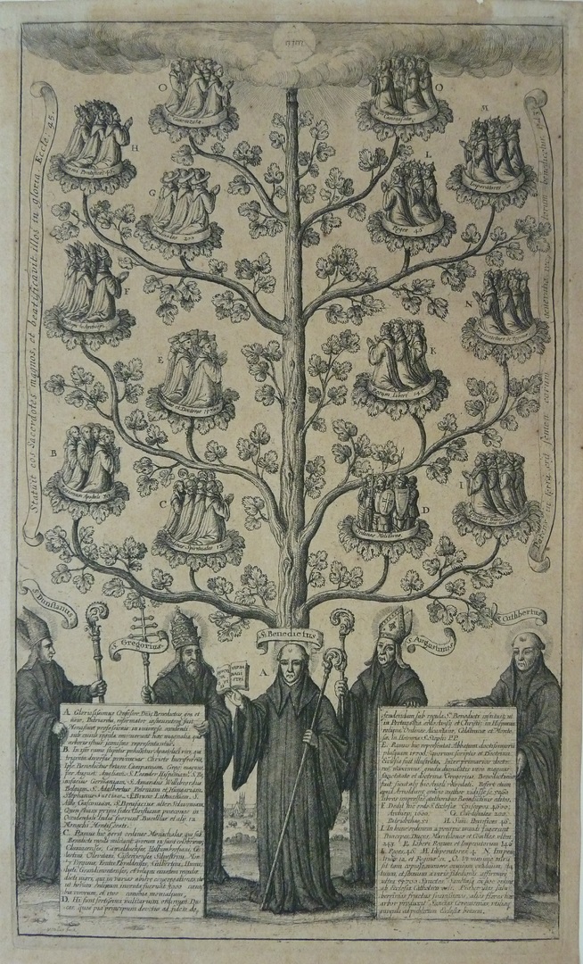 Benedictus met aan zijn zijde Dunstan, Gregorius de Grote, Augustinus en Cuthbertus, daarboven een boom met de hiërarchie volgens de Benedictijnen, eindigend in God in de vorm van een tetragram, eerste staat