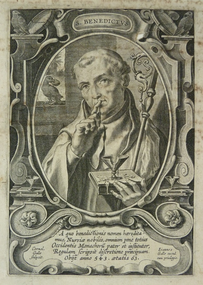 Gravure met portret van H. Benedictus met de gebroken gifbeker op een boek in de hand