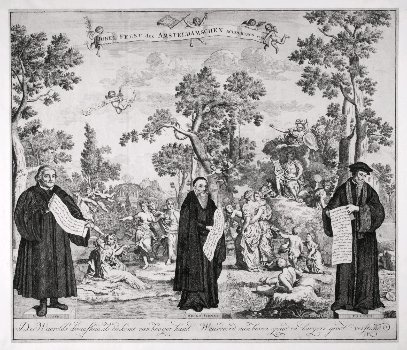 Spotprent op het 100-jarig bestaan van de Amsterdamse Schouwburg, Jubelfeest des Amsteldamschen Schouburgs, met Luther, Simons en Calvijn