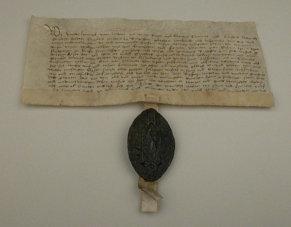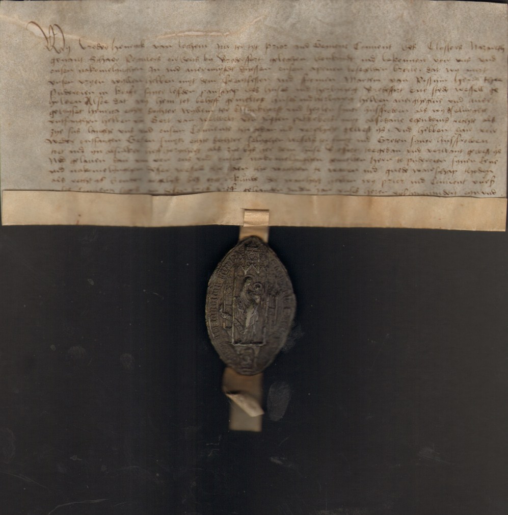 Koopakte van broeder Hendrick van Loghem, prior van het klooster van Nazareth (Nederland), met zegel met Maria met kind