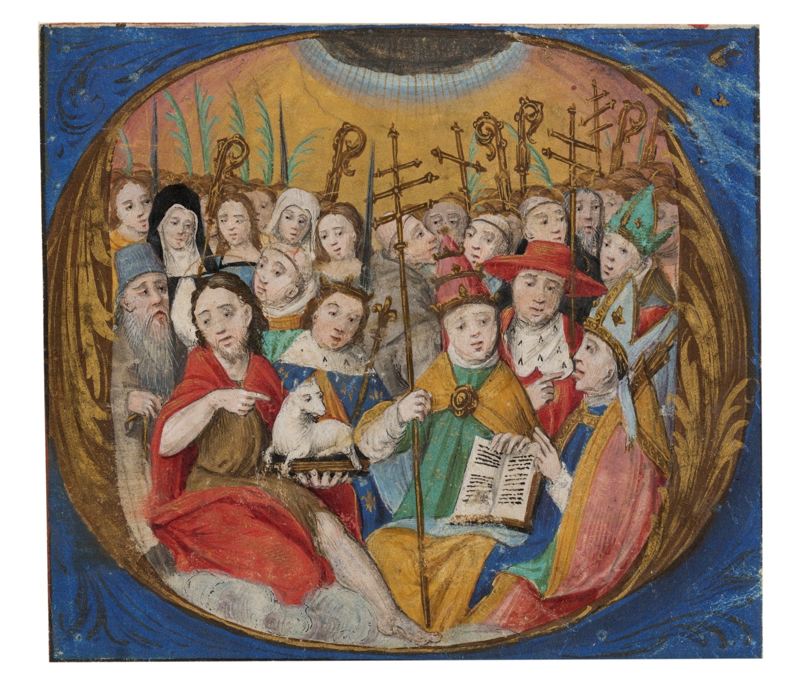 Initiaal 'O' van sequentie van Allerheiligen uit een graduale, met op keerzijde fragment van een strofe van de hymne 'De Omnibus Sanctis'