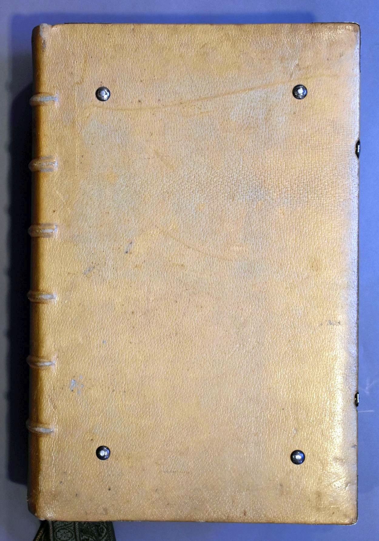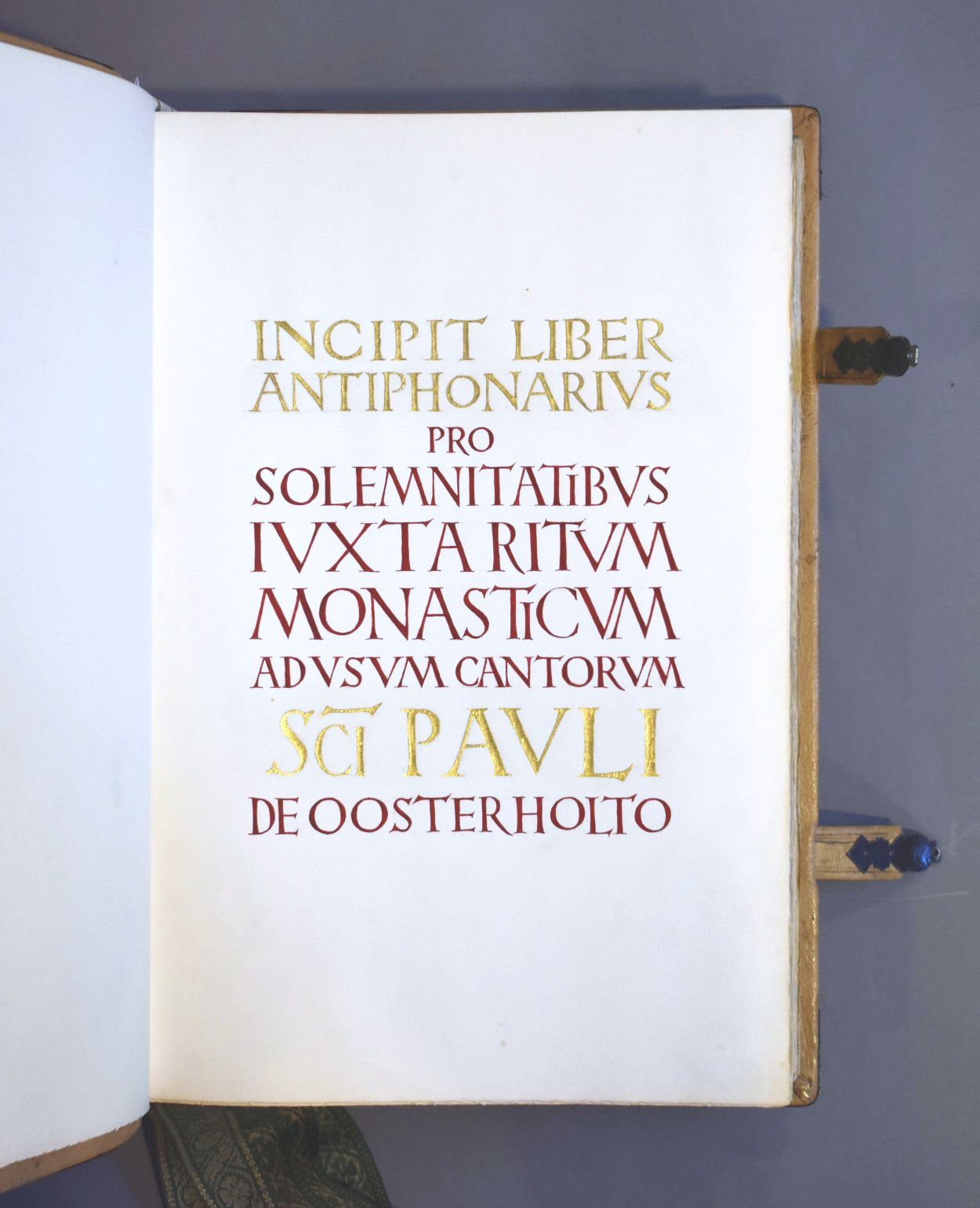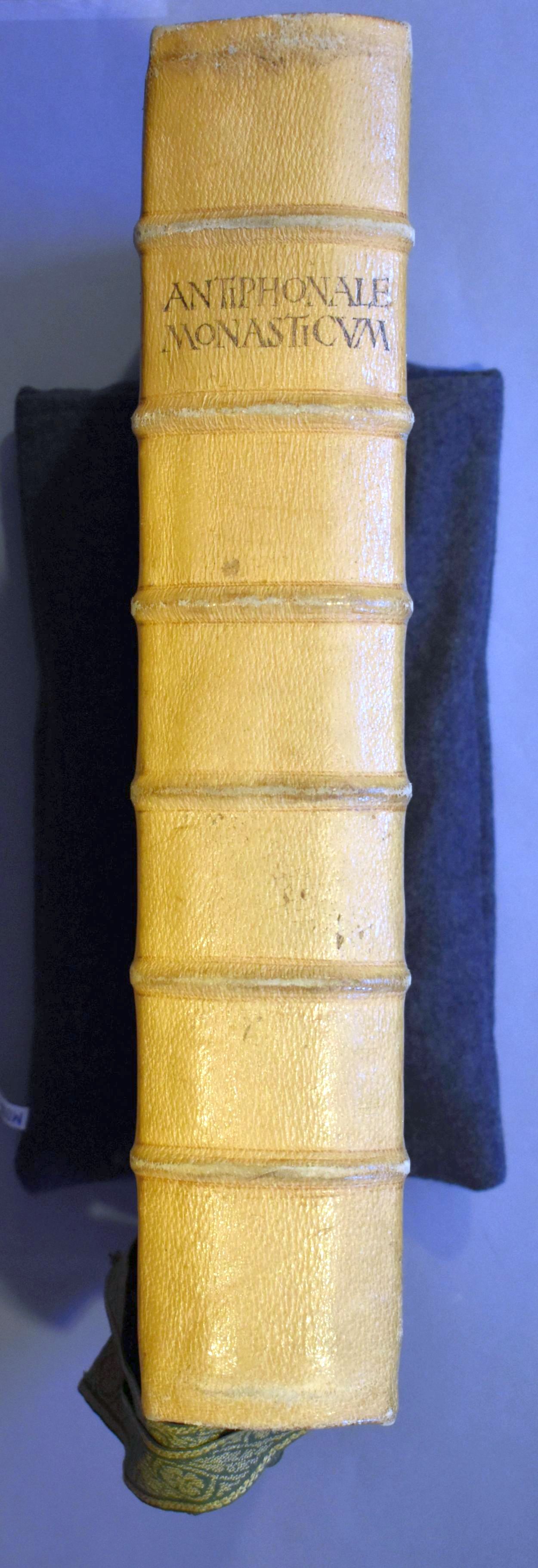 Antiphonale monasticum: Incipit liber antiphonarius pro solemnitatibus iuxtaritum monasticum ad usum cantorum Sci Pauli de Oosterholto. Het boek is voorzien van leren klamparmen met zilveren gehamerde sluitingen en acht groene leeslinten aan ivoren(?) houder.