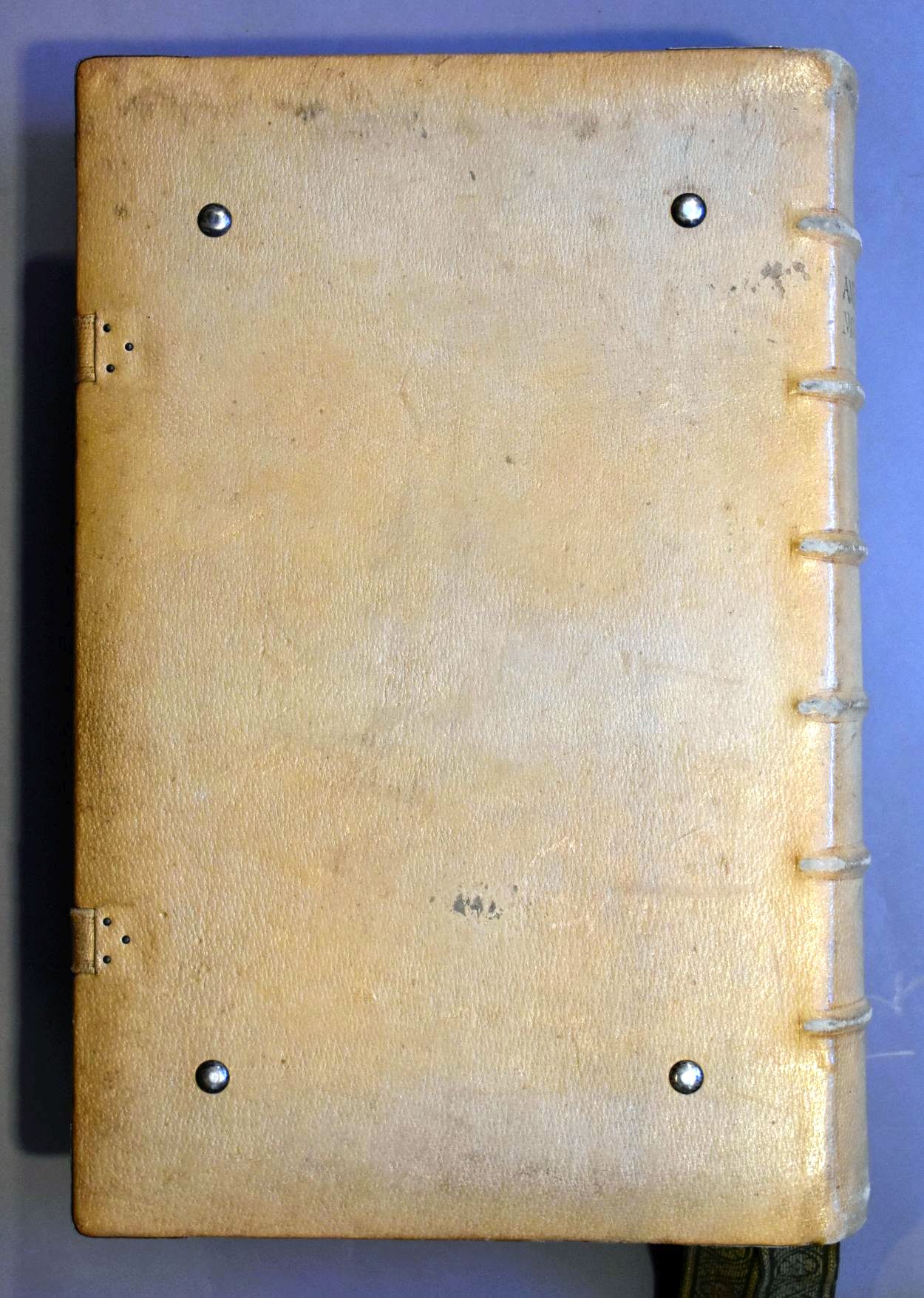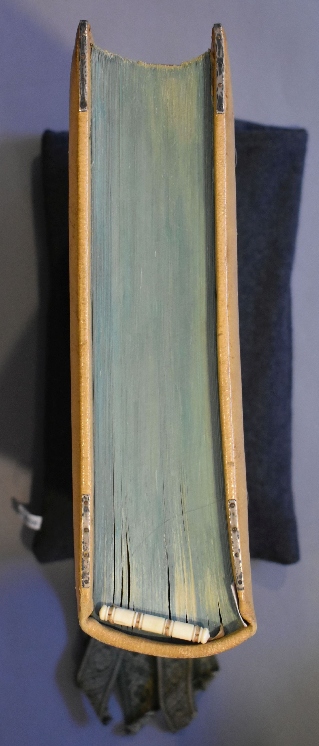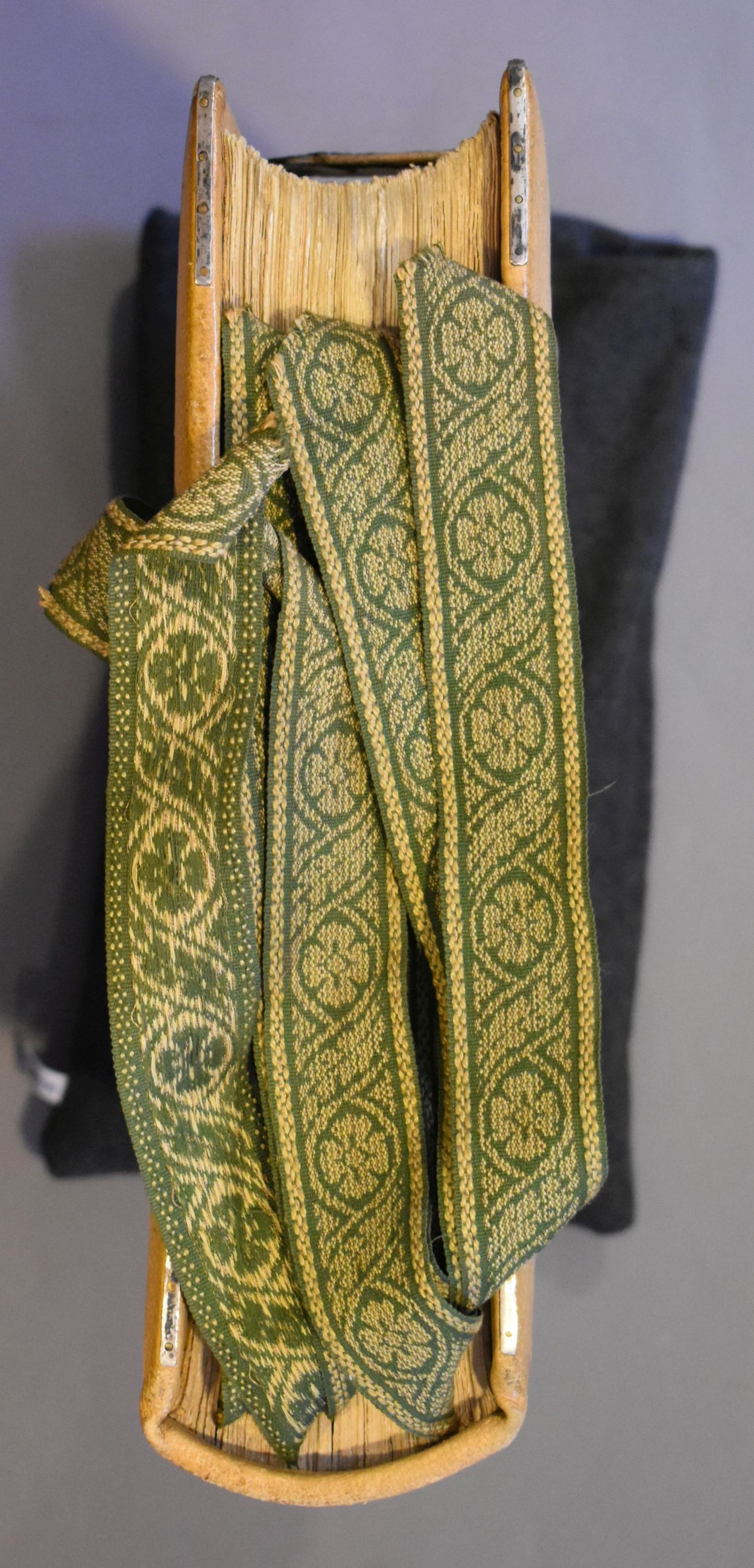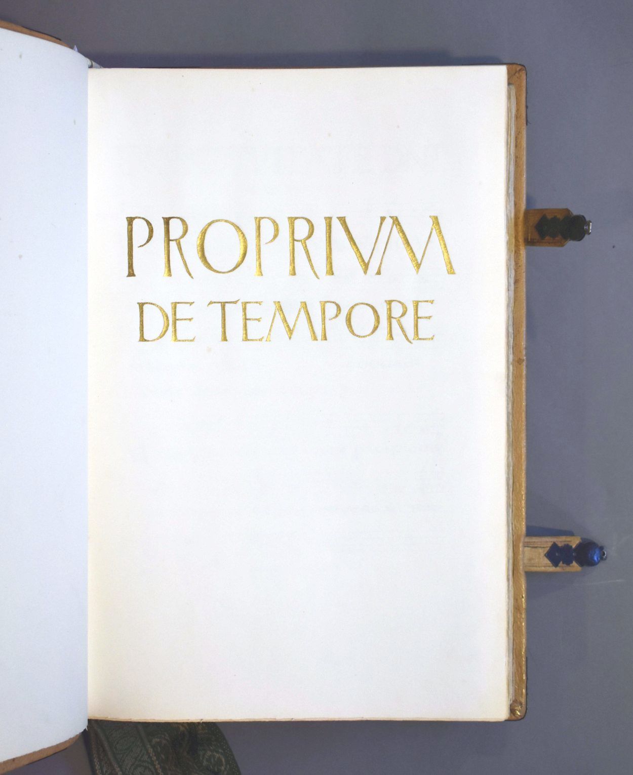 Antiphonale monasticum: Incipit liber antiphonarius pro solemnitatibus iuxtaritum monasticum ad usum cantorum Sci Pauli de Oosterholto. Het boek is voorzien van leren klamparmen met zilveren gehamerde sluitingen en acht groene leeslinten aan ivoren(?) houder.
