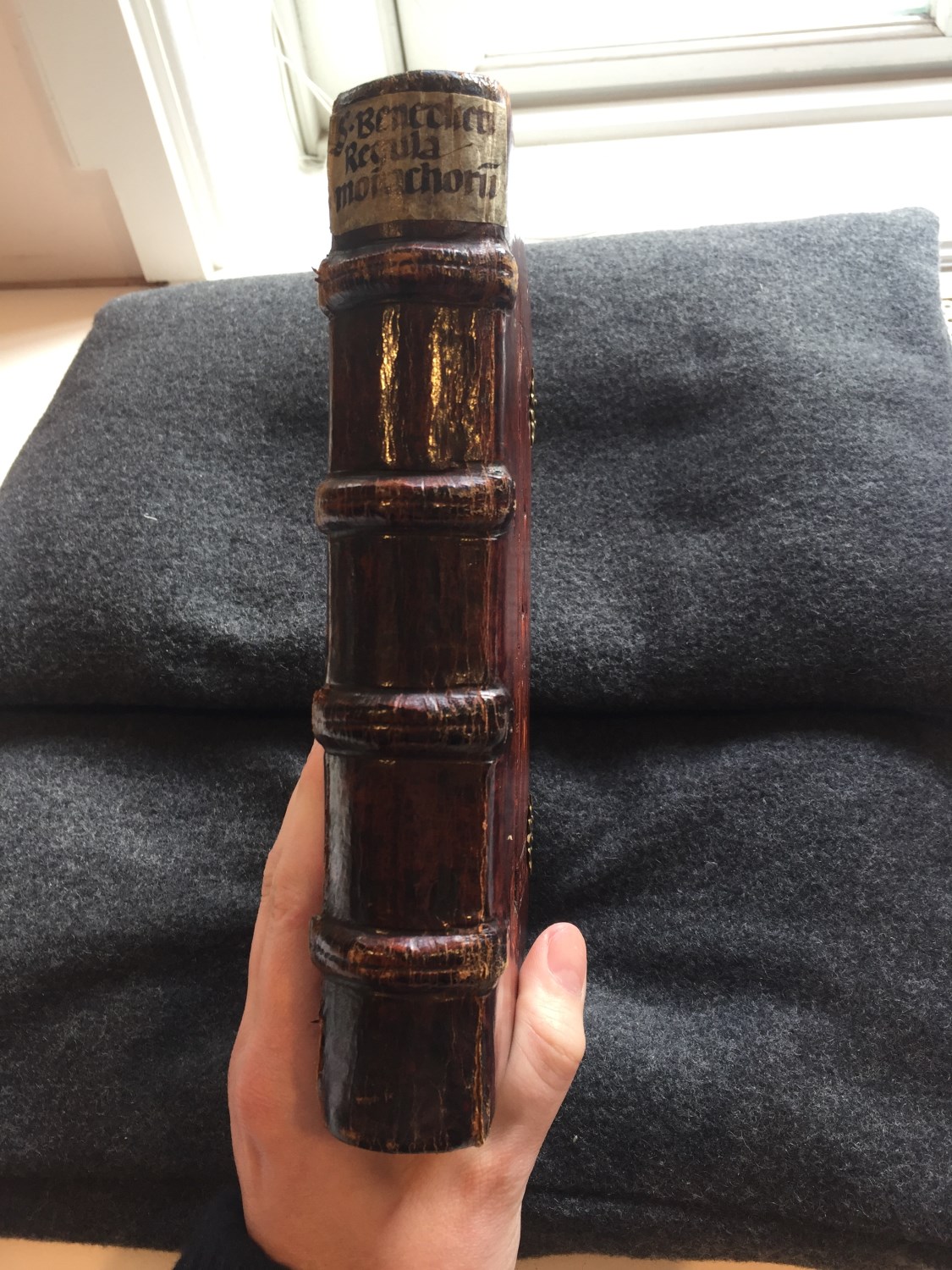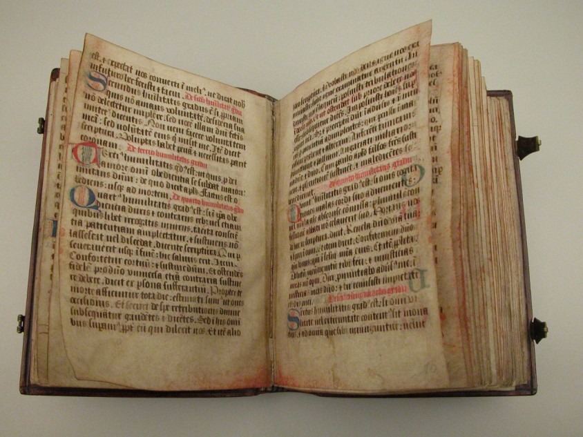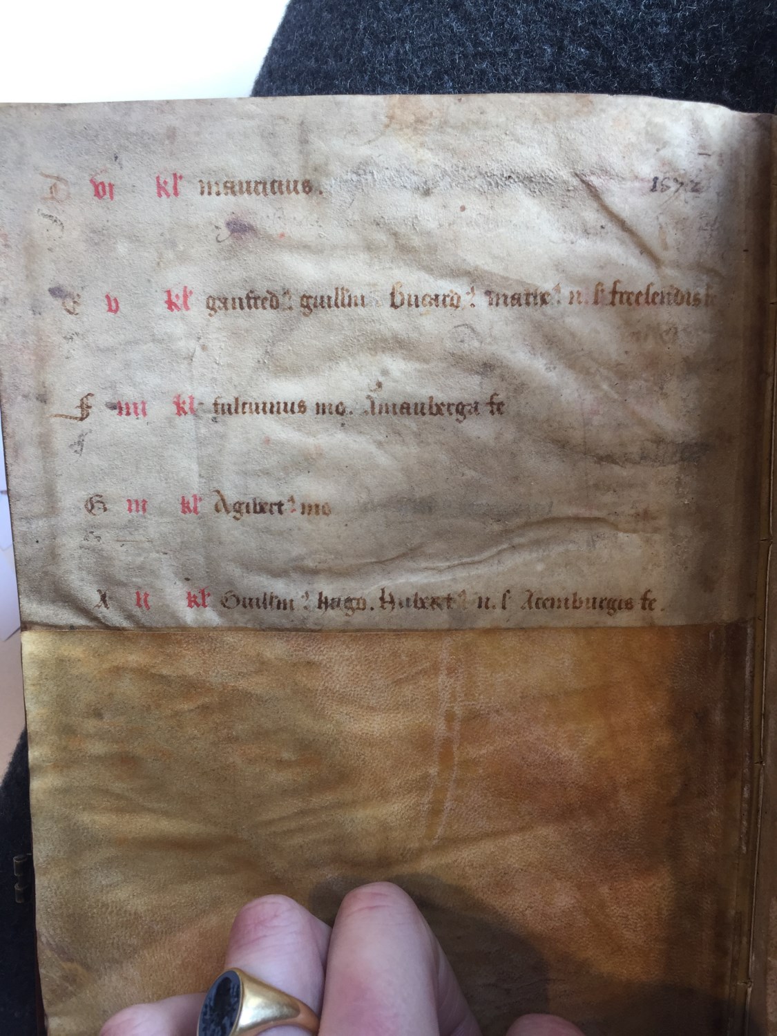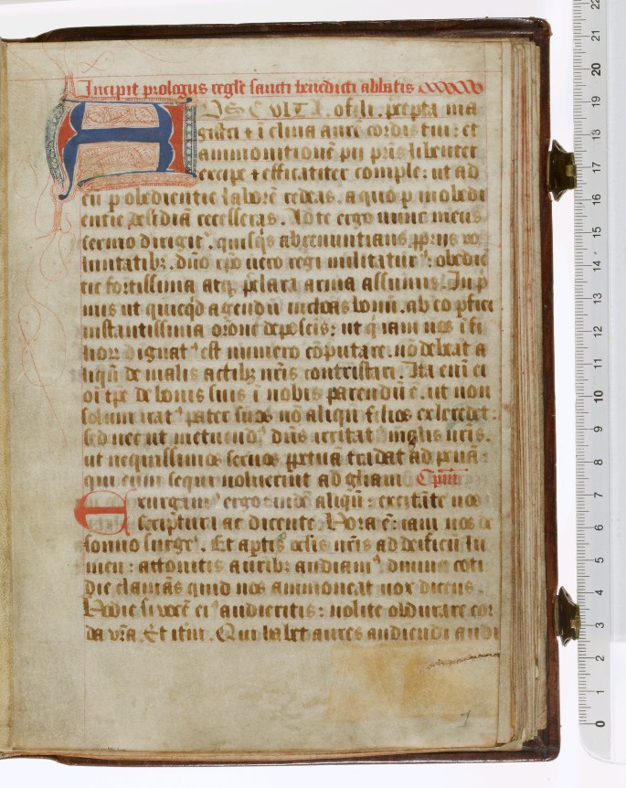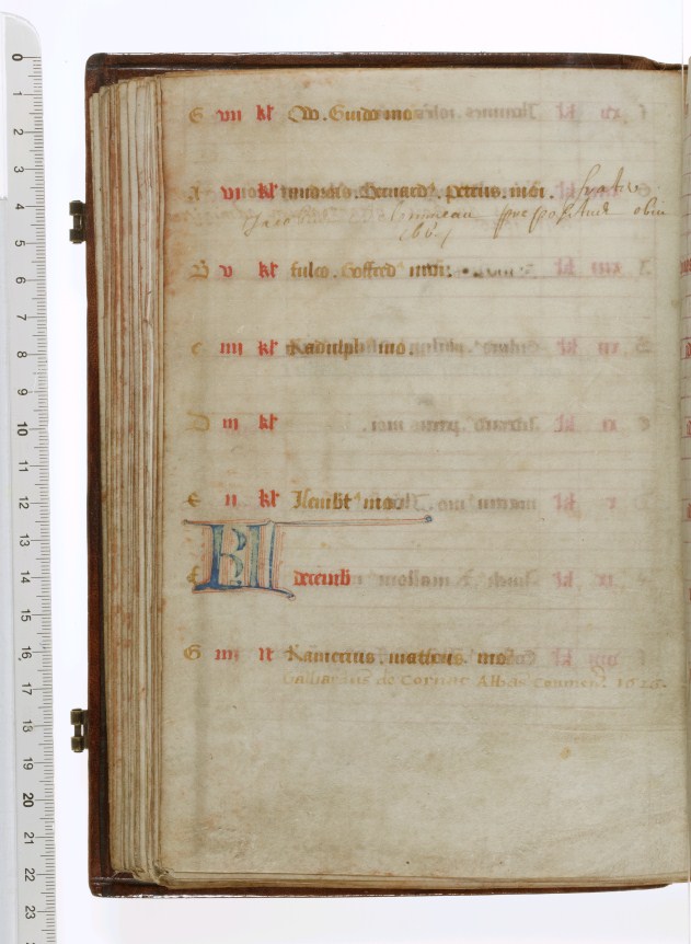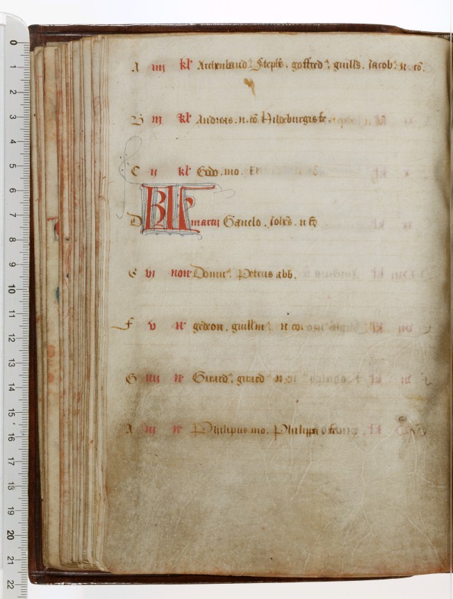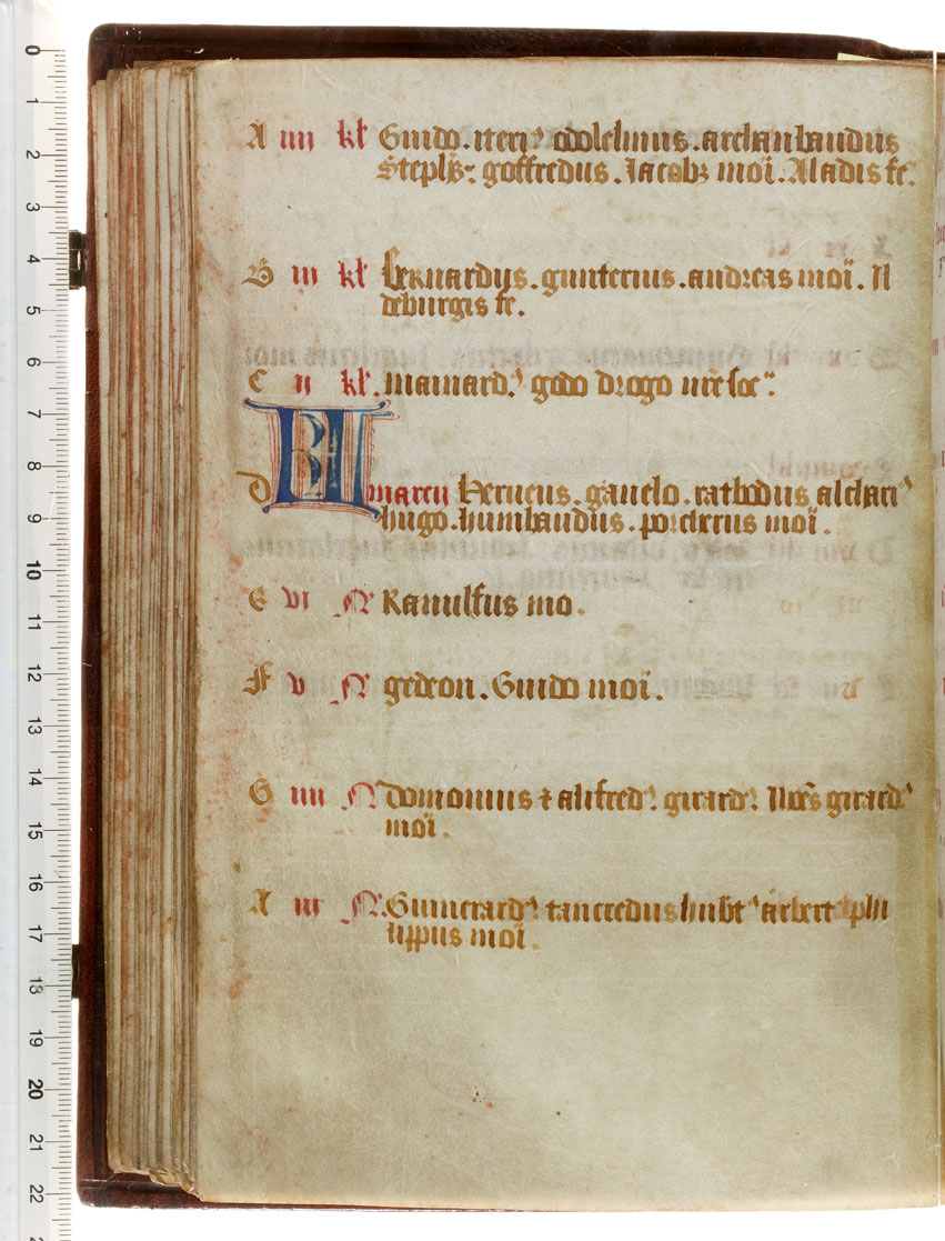 Dit 15de eeuwse handschrift draagt de Regel van Benedictus (Latijn) en twee delen uit een necrologium (een dodenboek waar een religieuze gemeenschap hun/haar doden in opschrijft om hen te herdenken op de verjaardag van hun sterfdag). Gumbert plaatste de necrologia en daarmee mogelijk ook de Regel van Benedictus in het Benedictijner abdij van Saint-Sauveur in ...