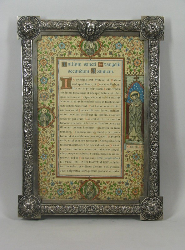 Canonbord met "Initium sancti ..." in houten lijst met zilveren beslag met florale motieven
